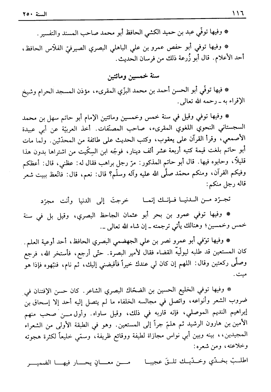 وفيها توفي وقيل في سنة خمس وخمسين ومائتين الإمام أبو حاتم سهل بن محمد السجستاني النحوي اللغوي المقرىء، صاحب المصنفات. أخذ العربية عن أبي عبيدة الأصمعي، وقرأ القرآن على يعقوب، وكتب الحديث على طائفة من المحدثين. ولما مات حاتم بلغت قيمة كتبه أربعة عشر ألف دينار، فوجه ابن السكيت من اشتراها بدون هذا قليلاً، وحابوه فيها. قال أبو حاتم المذكور: مر رجل براهب فقال له: عظني، قال: أعظكم وفيكم القرآن، ومنكم محمد صلى الله عليه وآله وسلم. قال: نعم، قال: فاتعظ ببيت شعر، قاله رجل منكم: