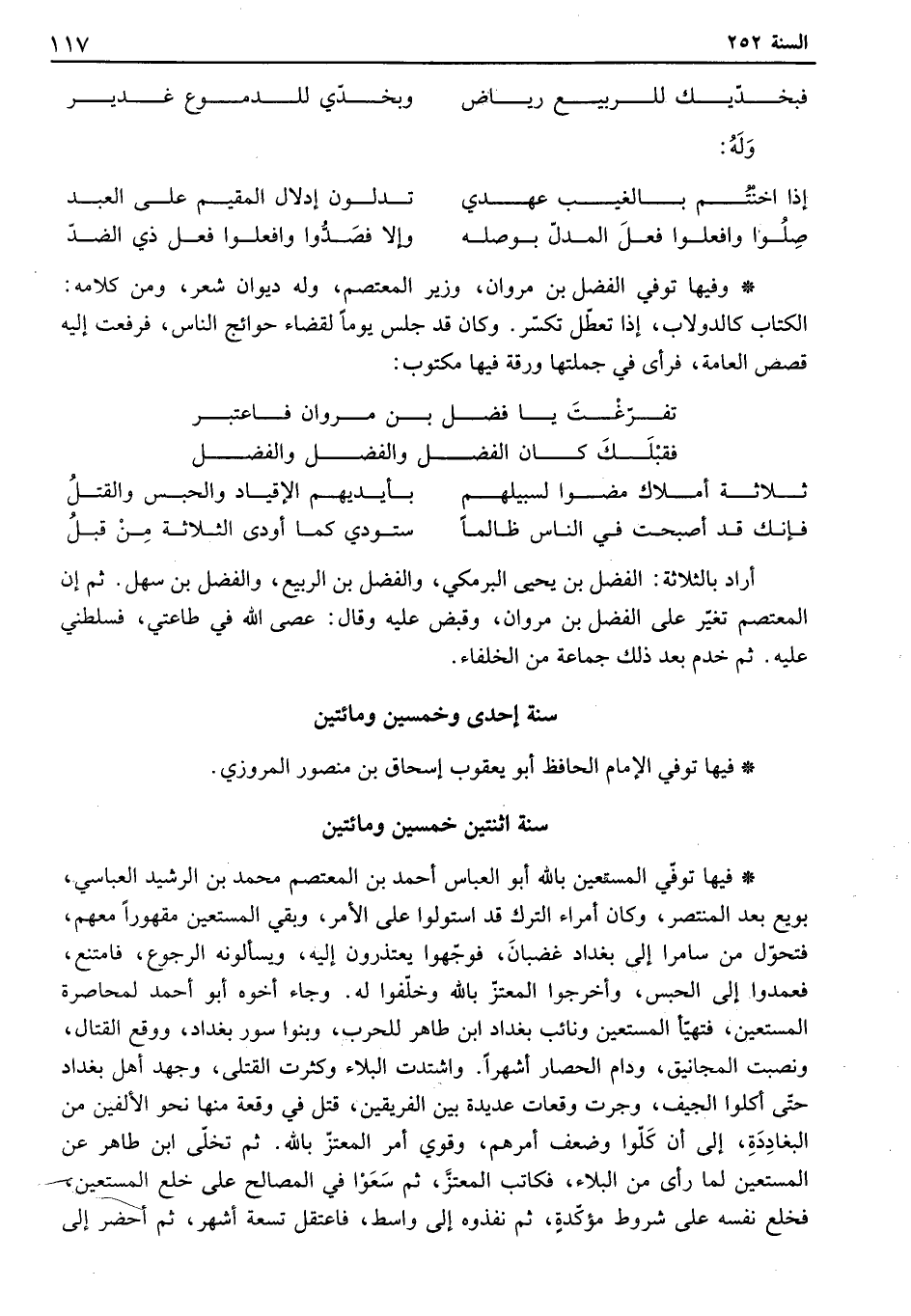 فيها توفي المستعين بالله أبو العباس أحمد بن المعتصم محمد بن الرشيد العباسي، بويع بعد المنتصر، وكان أمراء الترك قد استولوا على الأمر، وبقي المستعين مقهوراً معهم، فتحول من سامراً إلى بغداد غضبان، فوجهوا يعتذرون إليه، ويسألونه الرجوع، فامتنع، فعمدوا إلى الحبس، وأخرجوا المعتز بالله وخلفوا له. وجاء أخوه أبو أحمد لمحاصرة المستعين، فتهيأ المستعين ونائب بغداد ابن طاهر للحرب، وبنوا سور بغداد، ووقع القتال، ونصبت المجانيق، ودام الحصار أشهراً. واشتدت البلاء وكثرت القتلى، وجهد أهل بغداد حتى أكلوا الجيف، وجرت وقعات عديدة بين الفريقين، قتل في وقعة منها نحو الألفين من البغاددة، إلى أن كلوا وضعف أمرهم، وقوي أمر المعتز بالله. ثم تخلى ابن طاهر عن المستعين لما رأى من البلاء، فكاتب المعتز، ثم سعوا في المصالح على خلع المستعين فخلع نفسه على شروط مؤكدة، ثم نفذوه إلى واسط، فاعتقل تسعة أشهر، ثم أحضر إلى