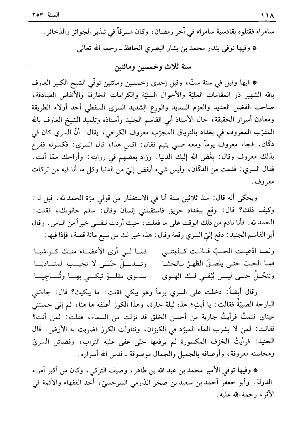 فيها وقيل في سنة ست، وقيل إحدى وخمسين ومائتين توفي الشيخ الكبير العارف بالله الشهير ذو المقامات العلية والأحوال السنية والكرامات الخارقة والأنفاس الصادقة، حب الفضل العديد والعزم السديد والورع الشديد السري السقطي أحد أولاء الطريقة، ومعادن أسرار الحقيقة، خال الأستاذ أبي القاسم الجنيد وأستاذه وتلميذ الشيخ العارف بالله المقرب المعروف في بغداد بالترياق المجرب معروف القرخي، يقال: أن السري كان في دكان، فجاء معروف يوماً ومعه صبي يتيم فقال: اكس هذا، قال السري: فكسوته ففرح بذلك معروف وقال: بغض الله إليك الدنيا. وزاد بعضهم في روايته: وأراحك مما أنت.، فقال السري: فقمت من الدكان، وليس شيء أبغض إلي من الدنيا وكل ما أنا فيه من تركات معروف.