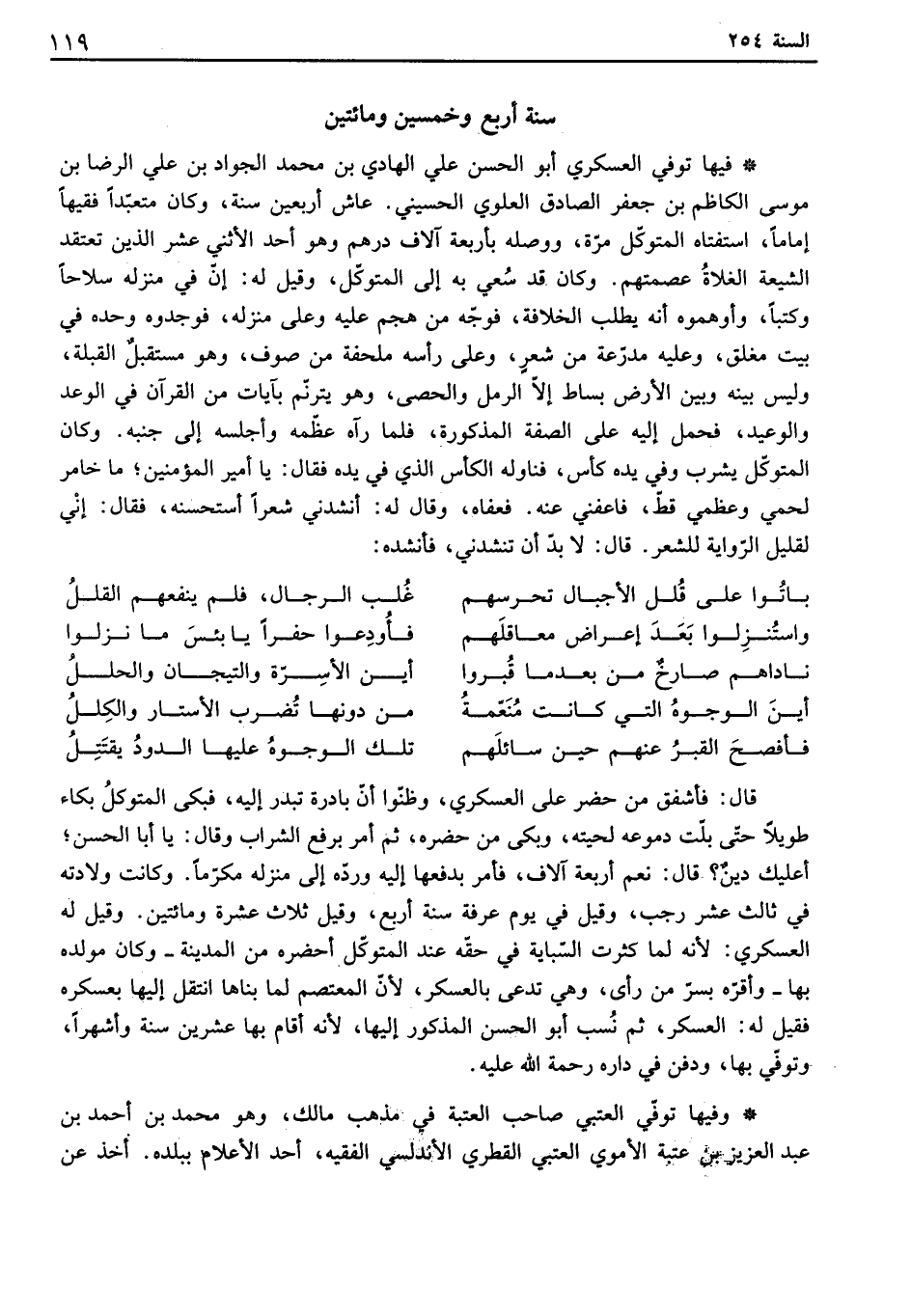 فيها توفي العسكري أبو الحسن علي الهادي بن محمد الجواد بن علي الرضا بر موسى الكاظم بن جعفر الصادق العلوي الحسيني. عاش أربعين سنة، وكان متعبداً فقيهاً إماماً، استفتاه المتوكل مرة، ووصله بأربعة آلاف درهم وهو أحد الأثني عشر الذين تعتظ الشيعة الغلاة عصمتهم. وكان قد سعي به إلى المتوكل، وقيل له: إن في منزله سلاحاً وكتباً، وأوهموه أنه يطلب الخلافة، فوجه من هجم عليه وعلى منزله، فوجدوه وحده في بيت مغلق، وعليه مدرعة من شعر، وعلى رأسه ملحفة من صوف، وهو مستقبل القبلة، وليس بينه وبين الأرض بساط إلا الرمل والحصى، وهو يترم بآيات من القرآن في الوعد والوعيد، فحمل إليه على الصفة المذكورة، فلما رآه عظمه وأجلسه إلى جنبه. وكان المتوكل يشرب وفي يده كأس، فناوله الكأس الذي في يده فقال: يا أمير المؤمنين، ما خامر لحمي وعظمي قط، فاعفني عنه. فعفاه، وقال له: أنشدني شعراً أستحسنه، فقال: إني لقليل الزواية للشعر. قال: لا بد أن تنشدني، فأنشده: