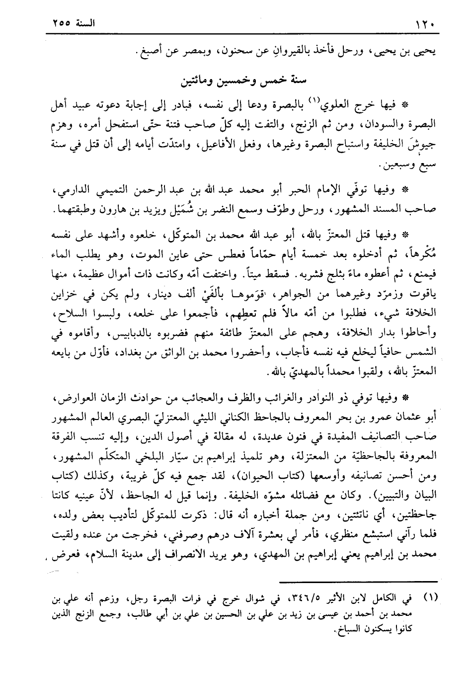 وفيها توفي ذو النوادر والغرائب والظرف والعجائب من حوادث الزمان العوارض، أبو عثمان عمرو بن بحر المعروف بالجاحظ الكناني الليثي المعتزلي البصري العالم المشهور صاحب التصانيف المفيدة في فنون عديدة، له مقالة في أصول الدين، وإليه تنسب الفرقة معروفة بالجاحظية من المعتزلة، وهو تلميذ إبراهيم بن سيار البلخي المتكلم المشهور، ومن أحسن تصانيفه وأوسعها " كتاب الحيوان "، لقد جمع فيه كل غريبة، وكذلك " كتاب بيان والتبيين ". وكان مع فضائله مشوه الخليفة. وإنما قيل له الجاحظ، لأن عينيه كانتا جاحظتين، أي ناتئتين، ومن جملة أخباره أنه قال: ذكرت للمتوكل لتأديب بعض ولده، فلما رآني استبشع منظري، فأمر لي بعشرة آلاف درهم وصرفني، فخرجت من عنده ولقيت محمد بن إبراهيم يعني إبراهيم بن المهدي، وهو يريد الإنصراف إلى مدينة السلام، فعرض