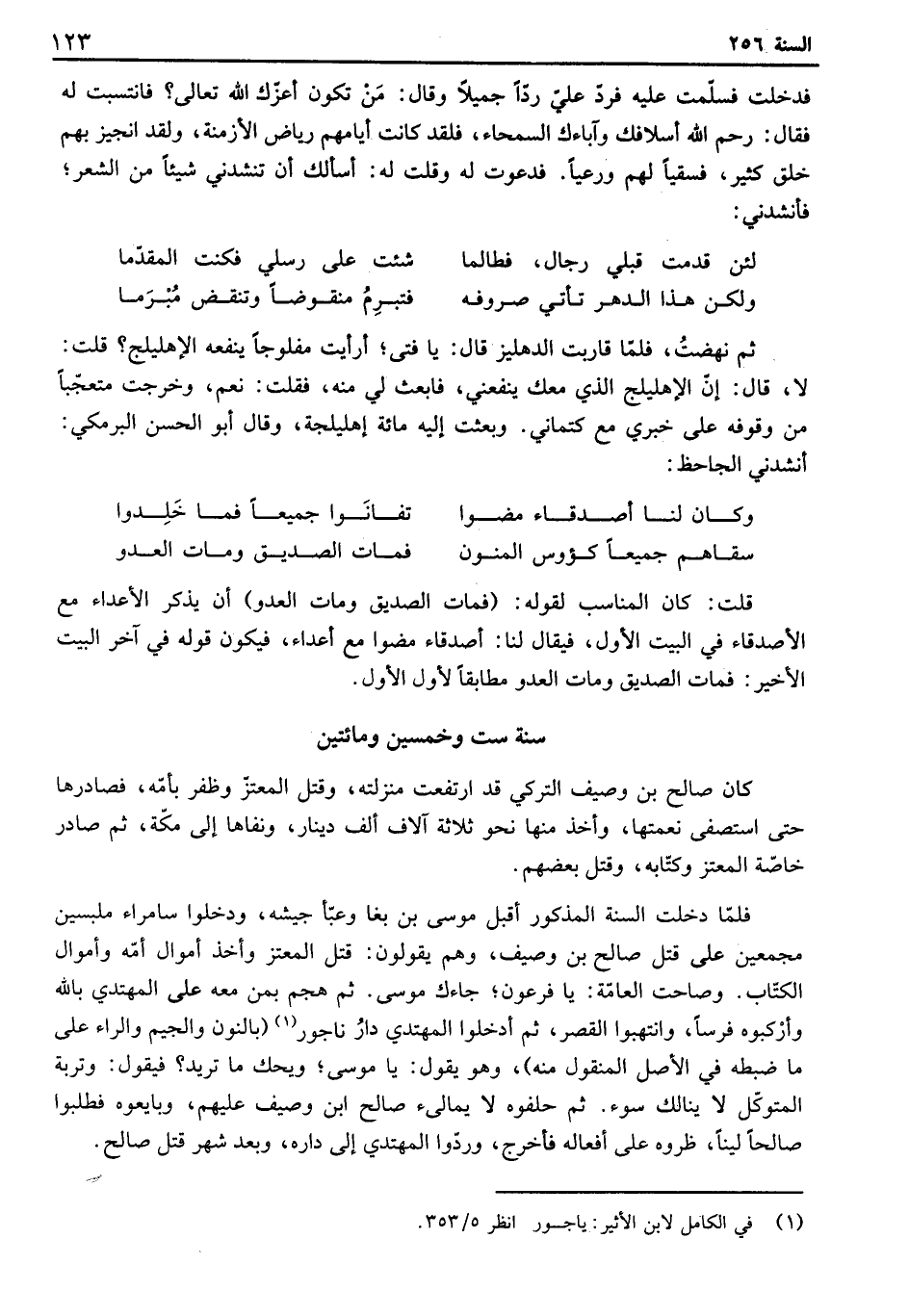 فلما دخلت السنة المذكور أقبل موسى بن بغا وعبأ جيشه، ودخلوا سامراء ملبسين مجمعين على قتل صالح بن وصيف، وهم يقولون: قتل المعتز وأخذ أموال أمه وأموال الكتاب. وصاحت العامة: يا فرعون، جاءك موسى. ثم هجم بمن معه على المهتدي وأركبوه فرساً، وانتهبوا القصر، ثم أدخلوا المهتدي دار ناجور " بالنون والجيم والراء على ما ضبطه في الأصل المنقول منه "، وهو يقول: يا موسى، ويحك ما تريد؟ فيقول: وتربة المتوكل لا ينالك سوء. ثم حلفوه لا يمالىء صالح ابن وصيف عليهم، وبايعوه فطلبوا صالحاً ليناً، ظروه على أفعاله فأخرج، وردوا المهتدي إلى داره، وبعد شهر قتل صالح.