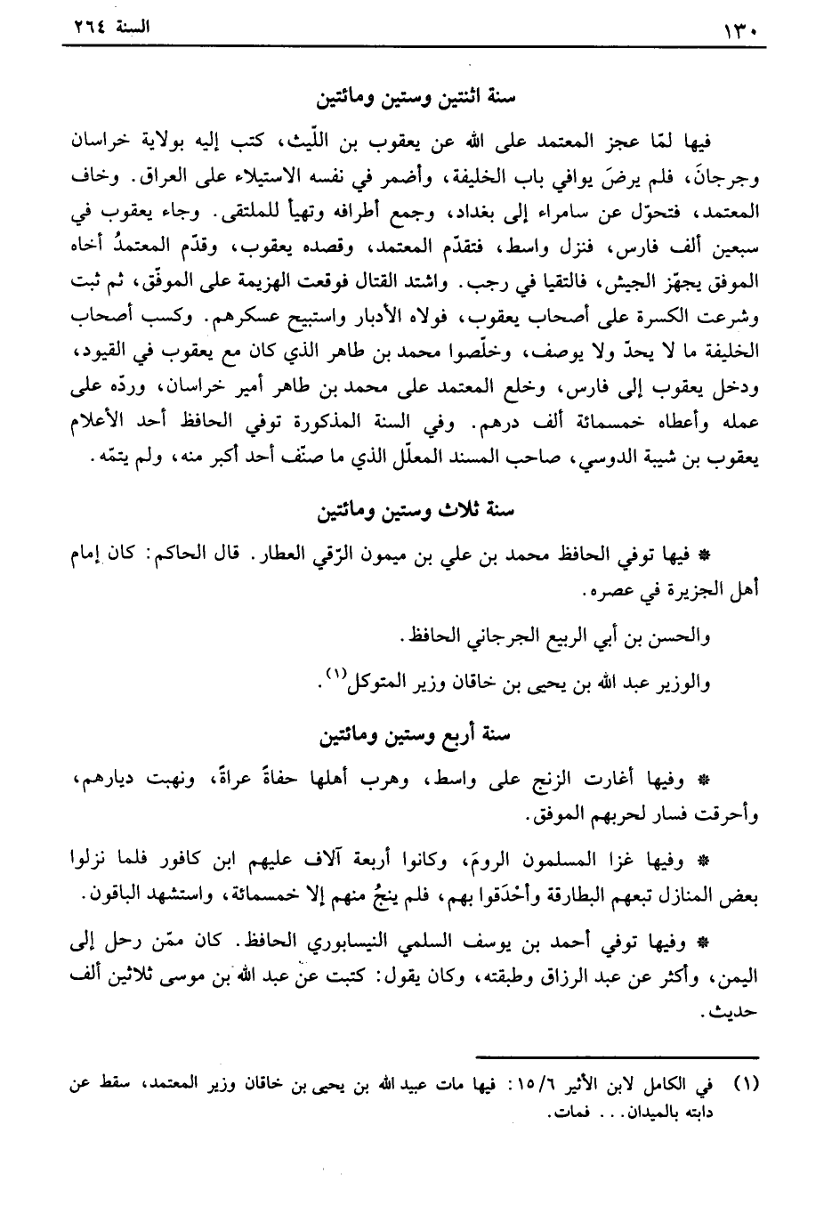 فيها لما عجز المعتمد على الله عن يعقوب بن الليث، كتب إليه بولاية خراسان وجرجان، فلم يرض يوافي باب الخليفة، وأضمر في نفسه الإستيلاء على العراق. وخاف المعتمد، فتحول عن سامراء إلى بغداد، وجمع أطرافه وتهيأ للملتقى. وجاء يعقوب في سبعين ألف فارس، فنزل واسط، فتقدم المعتمد، وقصده يعقوب، وقدم المعتمد أخاه الموفق يجهز الجيش، فالتقيا في رجب. واشتد القتال فوقعت الهزيمة على الموفق، ثم ثبت وشرعت الكسرة على أصحاب يعقوب، فولاه الأدبار واستبيح عسكرهم. وكسب أصحاب الخليفة ما لا يحد ولا يوصف، وخلصوا محمد بن طاهر الذي كان مع يعقوب في القيود، ودخل يعقوب إلى فارس، وخلع المعتمد على محمد بن طاهر أمير خراسان، ورده على عمله وأعطاه خمسمائة ألف درهم. وفي السنة المذكورة توفي الحافظ أحد الأعلام يعقوب بن شيبة الدوسي، صاحب المسند المعلل الذي ما صنف أحد أكبر منه، ولم يتمه.