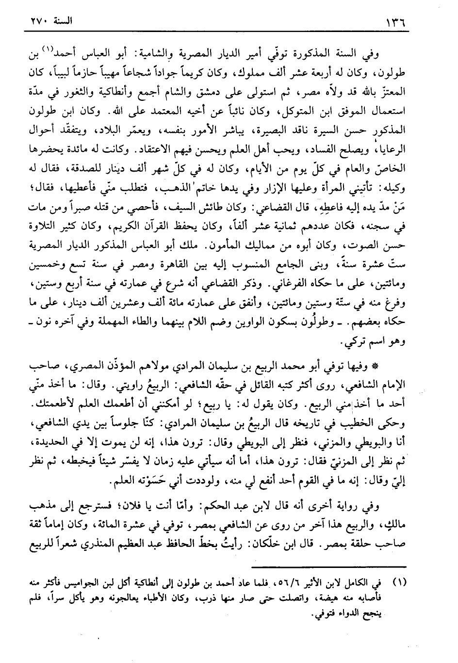 وفي السنة المذكورة توفي أمير الديار المصرية والشامية: أبو العباس أحمد بن طولون، وكان له أربعة عشر ألف مملوك، وكان كريماً جواداً شجاعاً مهيباً حازماً لبيباً، كان المعتز بالله قد ولاه مصر، ثم استولي على دمشق والشام أجمع وأنطاكية والثغور في مدة استعمال الموفق ابن المتوكل، وكان نائباً عن أخيه المعتمد على الله. وكان ابن طولون المذكور حسن السيرة ناقد البصيرة، يباشر الأمور بنفسه، ويعمر البلاد، ويتفقد أحوال الرعايا، ويصلح الفساد، ويحب أهل العلم ويحسن فيهم الإعتقاد. وكانت له مائدة يحضرها الخاص والعام في كل يوم من الأيام، وكان له في كل شهر ألف دينار للصدقة، فقال له وكيله: تأتيني المرأة وعليها الإزار وفي يدها خاتم الذهب، فتطلب مني فأعطيها، فقال، من مد يده إليه فاعطه، قال القضاعي: وكان طائش السيف، فأحصي من قتله صبراً ومن مات في سجنه، فكان عددهم ثمانية عشر ألفاً، وكان يحفظ القرآن الكريم، وكان كثير التلاوة حسن الصوت، وكان أبوه من مماليك المأمون. ملك أبو العباس المذكور الديار المصرية ست عشرة سنة، وبنى الجامع المنسوب إليه بين القاهرة ومصر في سنة تسع وخمسين ومائتين، على ما حكاه الفرغاني. وذكر القضاعي أنه شرع في عمارته في سنة أربع وستين، وفرغ منه في ستة وستين ومائتين، وأنفق على عمارته مائة ألف وعشرين ألف دينار، على ما حكاه بعضهم. وطولون بسكون الواوين وضم اللام بينهما والطاء المهملة وفي آخره نون وهو اسم تركي.