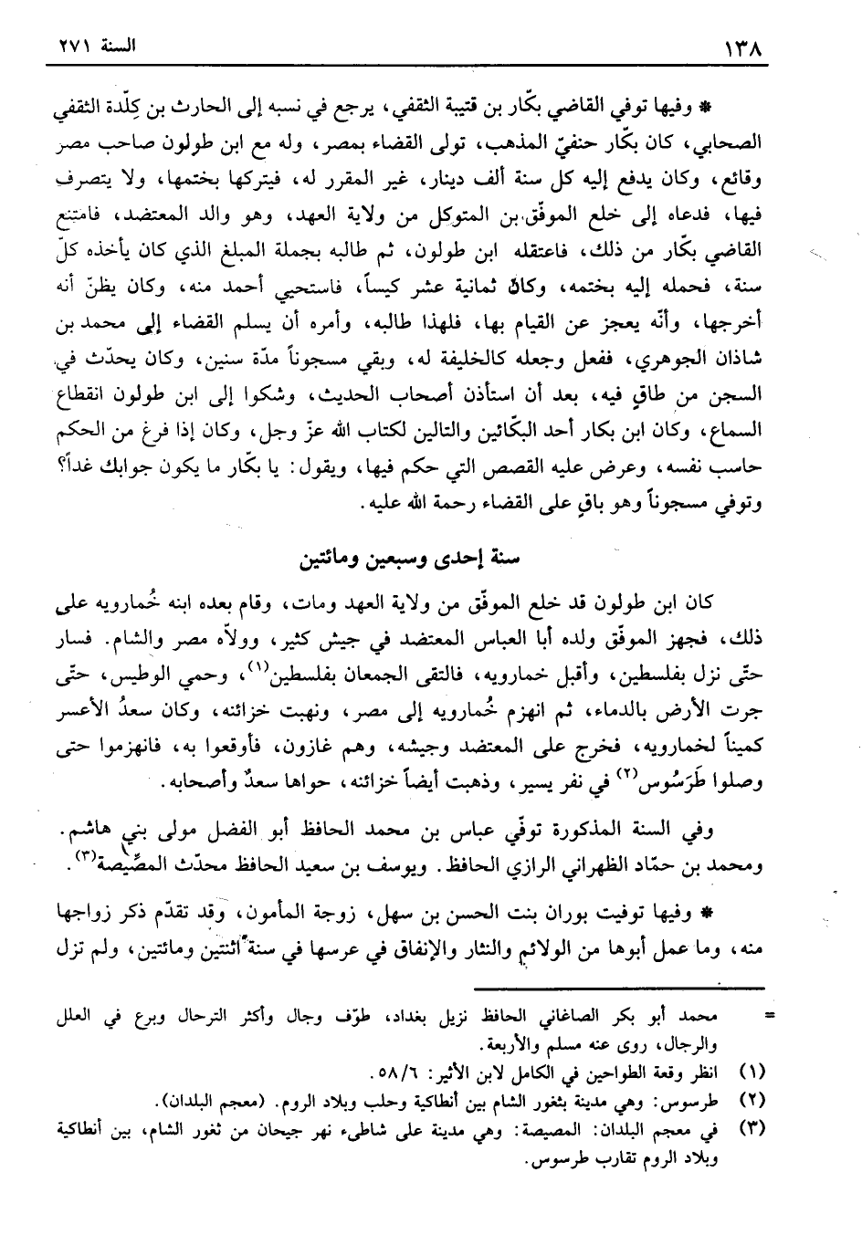 وفيها توفي القاضي بكار بن قتيبة الثقفي، يرجع في نسبه إلى الحارث بن كلدة الثقفي الصحابي، كان بكار حنفي المذهب، تولى القضاء بمصر، وله مع ابن طولون صاحب مصر وقائع، وكان يدفع إليه كل سنة ألف دينار، غير المقرر له، فيتركها بختمها، ولا يتصرف فيها، فدعاه إلى خلع الموفق ابن المتوكل من ولاية العهد، وهو والد المعتضد، فامتنع القاضي بكار من ذلك، فاعتقله ابن طولون، ثم طالبه بجملة المبلغ الذي كان يأخذه كل سنة، فحمله إليه بختمه، وكان ثمانية عشر كيساً، فاستحيي أحمد منه، وكان يظن أنه أخرجها، وأنه يعجز عن القيام بها، فلهذا طالبه، وأمره أن يسلم القضاء إلى محمد بن شاذان الجوهري، ففعل وجعله كالخليفة له، وبقي مسجوناً مدة سنين، وكان يحدث في السجن من طاق فيه، بعد أن استأذن أصحاب الحديث، وشكوا إلى ابن طولون انقطاع السماع، وكان ابن بكار أحد البكائين والتالين لكتاب الله عز وجل، وكان إذا فرغ من الحكم حاسب نفسه، وعرض عليه القصص التي حكم فيها، ويقول: يا بكار ما يكون جوابك غداً؟. وتوفي مسجوناً وهو باق على القضاء رحمة الله عليه.