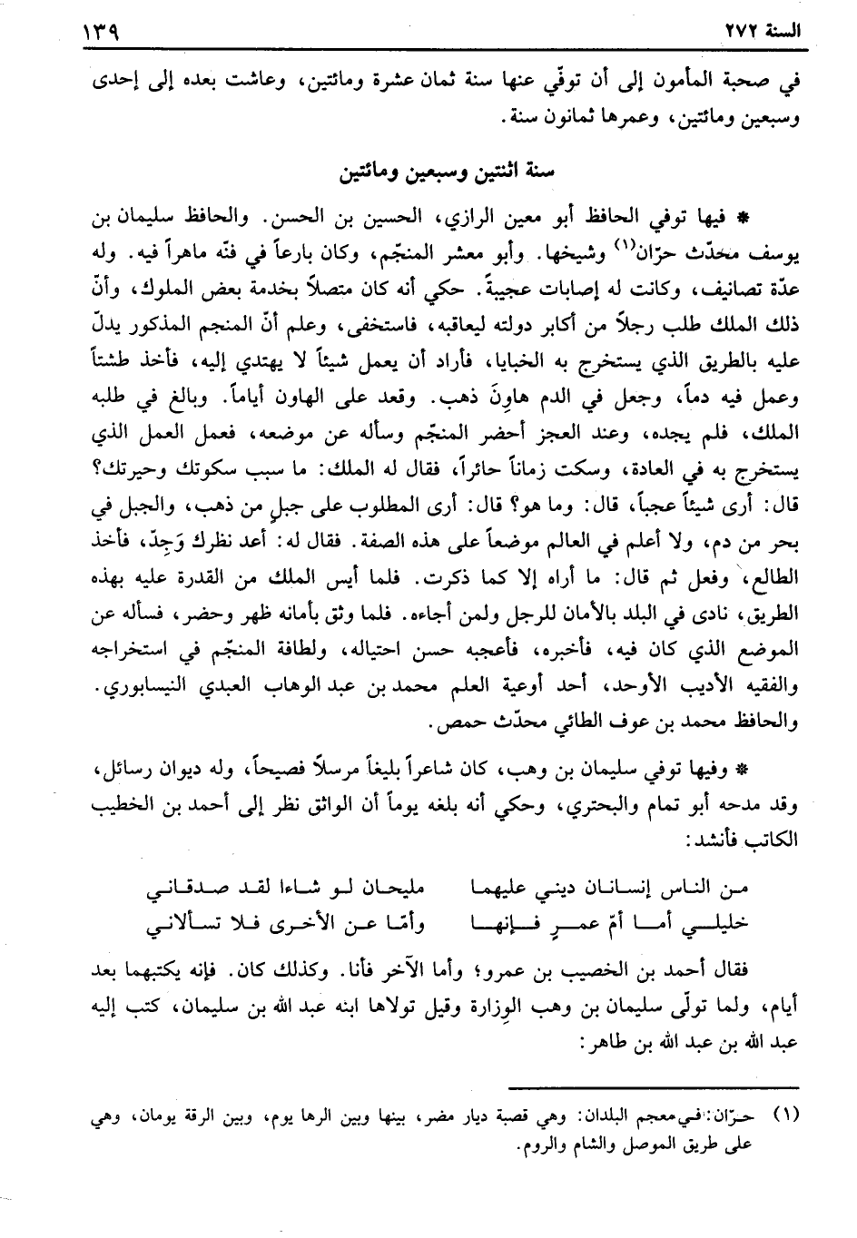 فيها توفي الحافظ أبو معين الرازي، الحسين بن الحسن. والحافظ سليمان بن يوسف محدث حران وشيخها. وأبو معشر المنجم، وكان بارعاً في فنه ماهراً فيه. وله عدة تصانيف، وكانت له إصابات عجيبة. حكي أنه كان متصلاً بخدمة بعض الملوك، وأن ذلك الملك طلب رجلاً من أكابر دولته ليعاقبه، فاستخفى، وعلم أن المنجم المذكور يدل عليه بالطريق الذي يستخرج به الخبايا، فأراد أن يعمل شيئاً لا يهتدي إليه، فأخذ طشتاً وعمل فيه دماً، وجعل في الدم هاون ذهب. وقعد على الهاون أياماً. وبالغ في طلبه الملك، فلم يجده، وعند العجز أحضر المنجم وسأله عن موضعه، فعمل العمل الذي يستخرج به في العادة، وسكت زماناً حائراً، فقال له الملك: ما سبب سكوتك وحيرتك. قال: أرى شيئاً عجباً، قال: وما هو؟ قال: أرى المطلوب على جبل من ذهب، والجبل في بحر من دم، ولا أعلم في العالم موضعاً على هذه الصفة. فقال له: أعد نظرك وجد، فأخذ الطالع، وفعل ثم قال: ما أراه إلا كما ذكرت. فلما أيس الملك من القدرة عليه بهذه الطريق، ناس في البلد بالأمان للرجل ولمن أجاءه. فلما وثق بأمانه ظهر وحضر، فسأله عن الموضع الذي كان فيه، فأخبره، فأعجبه حسن احتياله، ولطافة المنجم في استخراجه والفقيه الأديب الأوحد، أحد أوعية العلم محمد بن عبد الوهاب العبدي النيسابوري. والحافظ محمد بن عوف الطائي محدث حمص.