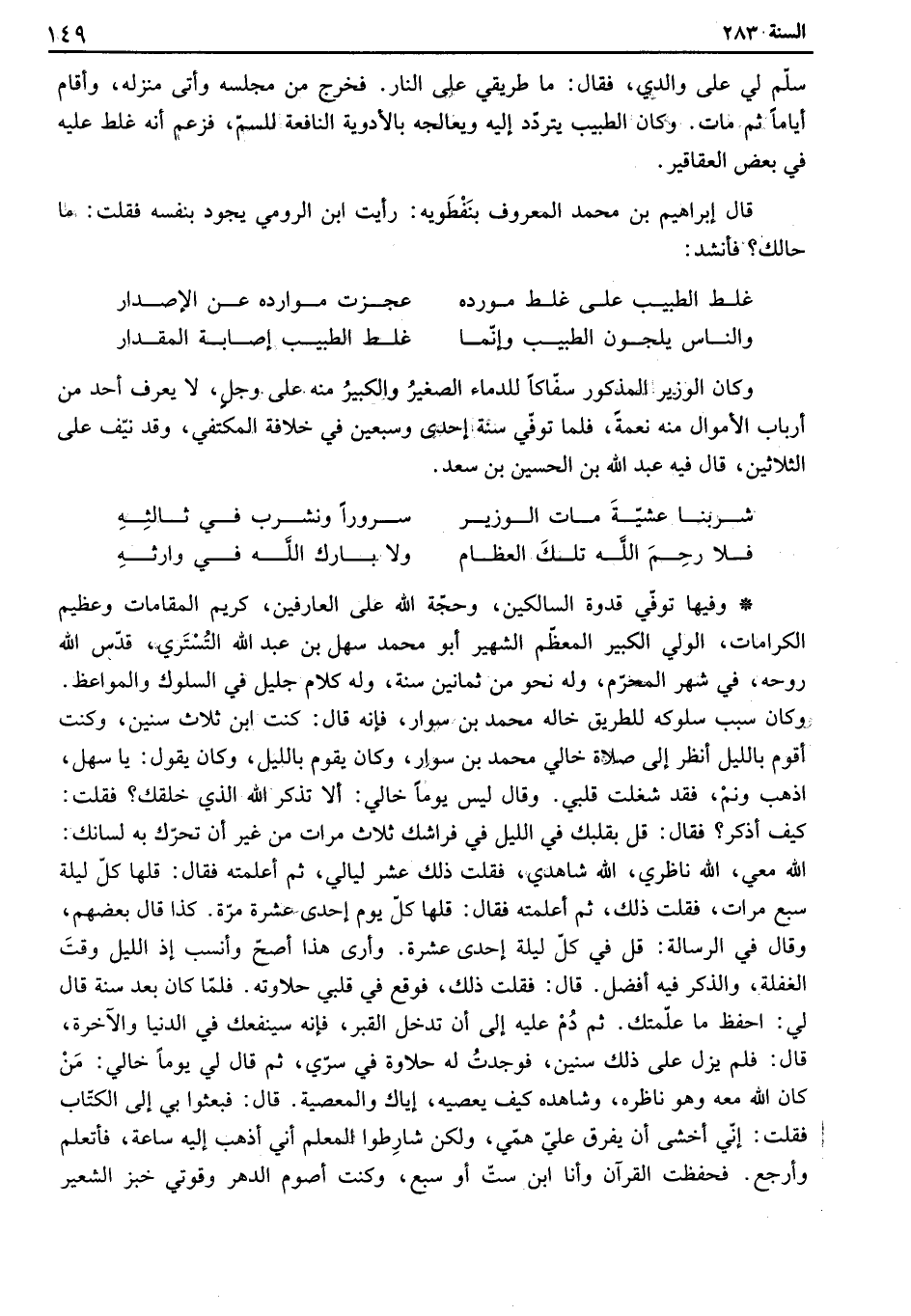 وفيها توفي قدوة السالكين، وحجة الله على العارفين، كريم المقامات وعظيم الكرامات، الولي الكبير المعظم الشهير أبو محمد سهل بن عبد الله التستري، قدس الله روحه، في شهر المحرم، وله نحو من ثمانين سنة، وله كلام جليل في السلوك والمواعظ وكان سبب سلوكه للطريق خاله محمد بن سوار، فإنه قال: كنت ابن ثلاث سنين، وكنت أقوم بالليل أنظر إلى صلاة خالي محمد بن سوار، وكان يقوم بالليل، وكان يقول: يا سهل اذهب ونم، فقد شغلت قلبي. وقال ليس يوماً خالي: ألا تذكر الله الذي خلقك؟. فقلت: كيف أذكر؟. فقال: قل بقلبك في الليل في فراشك ثلاث مرات من غير أن تحرك به لسان: الله معي، الله ناظري، الله شاهدي، فقلت ذلك عشر ليالي، ثم أعلمته فقال: قلها كل سبع مرات، فقلت ذلك، ثم أعلمته فقال: قلها كل يوم إحدى عشرة مرة. كذا قال بعضهم، وقال في الرسالة: قل في كل ليلة إحدى عشرة. وأرى هذا أصح وأنسب إذ الليل وقت الغفلة، والذكر فيه أفضل. قال: فقلت ذلك، فوقع في قلبي حلاوته. فلما كان بعد سنة قال لي: احفظ ما علمتك. ثم دم عليه إلى أن تدخل القبر، فإنه سينفعك في الدنيا والآخرة، قال: فلم يزل على ذلك سنين، فوجدت له حلاوة في سري، ثم قال لي يوماً خالي: كان الله معه وهو ناظره، وشاهده كيف يعصيه، إياك والمعصية. قال: فبعثوا بي إلى الكتاب فقلت: إني أخشى أن يفرق علي همي، ولكن شارطوا المعلم أني أذهب إليه ساعة، فأتعلم وأرجع. فحفظت القرآن وأنا ابن ست أو سبع، وكنت أصوم الدهر وقوتي خبز الشعير