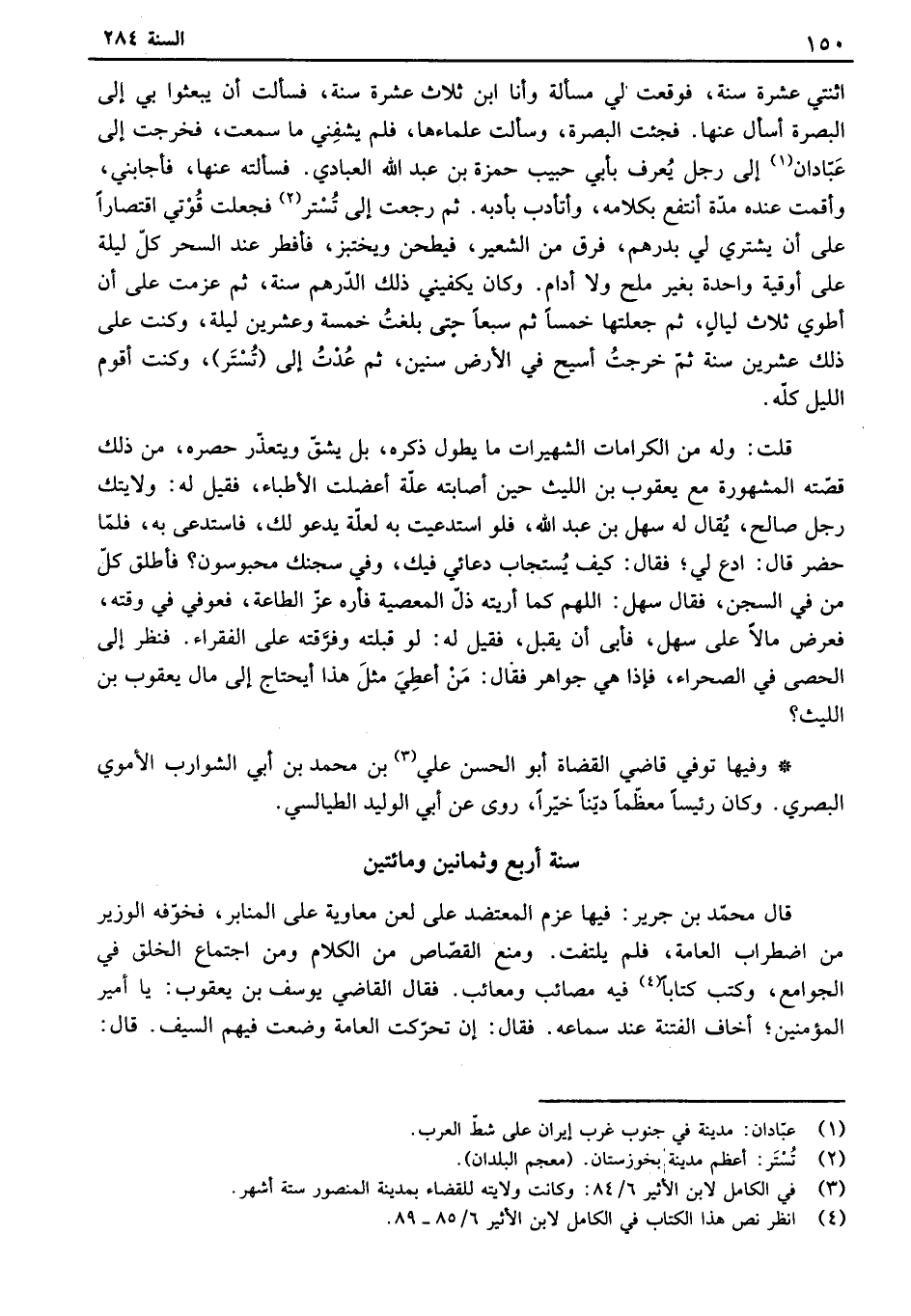 قلت: وله من الكرامات الشهيرات ما يطول ذكره، بل يشق ويتعذر حصره، من ذلك قصته المشهورة مع يعقوب بن الليث حين أصابته علة أعضلت الأطباء، فقيل له: ولايتك رجل صالح، يقال له سهل بن عبد الله، فلو استدعيت به لعلة يدعو لك، فاستدعى به، فلما حضر قال: ادع لي، فقال: كيف يستجاب دعائي فيك، وفي سجنك محبوسون؟ . فأطلق كل من في السجن، فقال سهل: اللهم كما أريته ذل المعصية فأره عز الطاعة، فعوفي في وقته، فعرض مالاً على سهل، فأبى أن يقبل، فقيل له: لو قبلته وفرقته على الفقراء. فنظر إلى الحصى في الصحراء، فإذا هي جواهر فقال: من أعطي مثل هذا أيحتاج إلى مال يعقوب بن الليث؟ وفيها توفي قاضي القضاه أبو الحسن علي بن محمد بن أبي الشوارب الأموي بصري. وكان رئيساً معظماً ديناً خيراً، روى عن أبي الوليد الطيالسي.