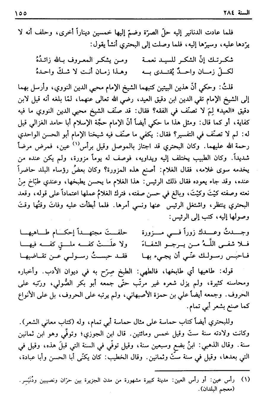 قلت: وحكي أن هذين البيتين كتبهما الشيخ الإمام محيي الدين النووي، وأرسل بهما إلى الشيخ الإمام تقي الدين ابن دقيق العيد، رضي الله تعالى عنهما، لما بلغه أنه قيل دقيق " العيد "، لم لا تصنف في الفقه؟ فقال: قد صنف الشيخ محيي الدين النووي ما فيه كفاية، أو كما قال: ومثل هذا ما حكي أيضاً أن الإمام حجة الإسلام أبا حامد الغزالي قيل له: لم لا تصنف في التفسير؟. فقال: يكفي ما صنف فيه شيخنا الإمام أبو الحسن الواحدي رحمة الله عليهما. وكان البحتري قد اجتاز بالموصل وقيل برأس عين، فمرض مرضاً شديداً. وكان الطبيب يختلف إليه ويداويه، فوصف له يوماً مزورة، ولم يكن عنده من يخدمه سوى غلامه، فقال الغلام: أصنع هذه المزورة؟. وكان بعض رؤساء البلد حاضراً عنده، وقد جاء يعوده فقال ذلك الرئيس: هذا الغلام ما يحسن يطبخها، وعندي طباخ من نعته وصفته كيت وكنت، وبالغ في حسن صفته، فترك الغلام عملها اعتماداً على قوله، البحتري ينتظر، واشتغل الرئيس عنها ونسي أمرها. فلما أبطأت عليه وفات وقتها وصولها إليه، كتب إلى الرئيس: