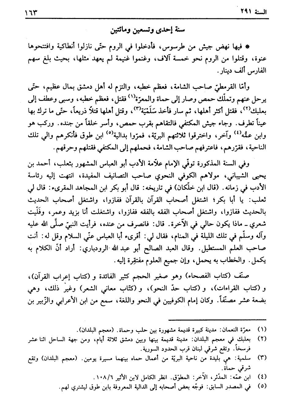 وفي السنة المذكورة توفي الإمام علامة الأدب أبو العباس المشهور بثعلب، أحمد بن يحيى الشيباني، مولاهم الكوفي النحوي صاحب التصانيف المفيدة، انتهت إليه رئاس الأدب في زمانه. " قال ابن خلكان " في تاريخه: قال أبو بكر ابن المجاهد المقرىء: قال لي ثعلب: يا أبا بكر، اشتغل أصحاب القرآن بالقرآن ففازوا، واشتغل أصحاب الحديث بالحديث ففازوا، واشتغل أصحاب الفقه بالفقه ففازوا، واشتغلت أنا بزيد وعمر، وفليت شعري ماذا يكون حالي في الآخرة. قال: فانصرف من عنده، فرأيت النبي صلى الله عليه وآله وسلم في تلك الليلة في المنام، فقال لي: أقرىء أبا العباس عني السلام وقل له: أنت صاحب العلم المستطيل. وقال العبد الصالح أبو عبد الله. الرودباري: أراد أن الكلام به يكمل. والخطاب به يحمل، وإن جميع العلوم مفتقرة إليه.