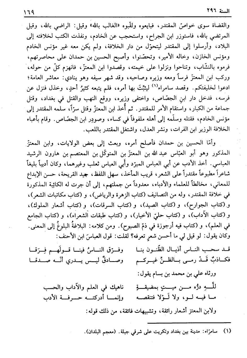 وأما الحسين بن حمدان فأصلح أمره، وبعث إلى بعض الولايات، وابن المعتز المذكور وهو أبو العباس عبد الله بن المعتز بن المتوكل بن المعتصم بن هارون الرشيد العباسي. أخذ الأدب عن أبي العباس المبرد وأبي العباس ثعلب وغيرهما، وكان أديباً بليغاً شاعراً مطبوعاً مقتدراً على الشعر، قريب المأخذ، سهل اللفظ، جيد القريحة، حسن الإبداع للمعاني، مخالطاً للعلماء والأدباء، معدوداً من جملتهم، إلى أن جرت له الكاتبة المذكور في خلافة المقتدر، وله من التصانيف " كتاب الزهرة والرياض "، و " كتاب مكاتبات الشعر " و " كتاب الجوارح "، و " كتاب الصيد "، و " كتاب السرقات "، و " كتاب أشعار الملوك " و " كتاب الآداب "، و " كتاب حلي الأخبار "، و " كتاب طبقات الشعراء "، و " كتاب الجامع في العلم "، و " كتاب فيه أرجوزة في ذم الصبوح ". ومن كلامه: البلاغة البلوغ إلى المعنى وكان يقول: لو قيل لي ما أحسن شعر تعرفه؟. لقلت: قول العباس ابن الأحنف: