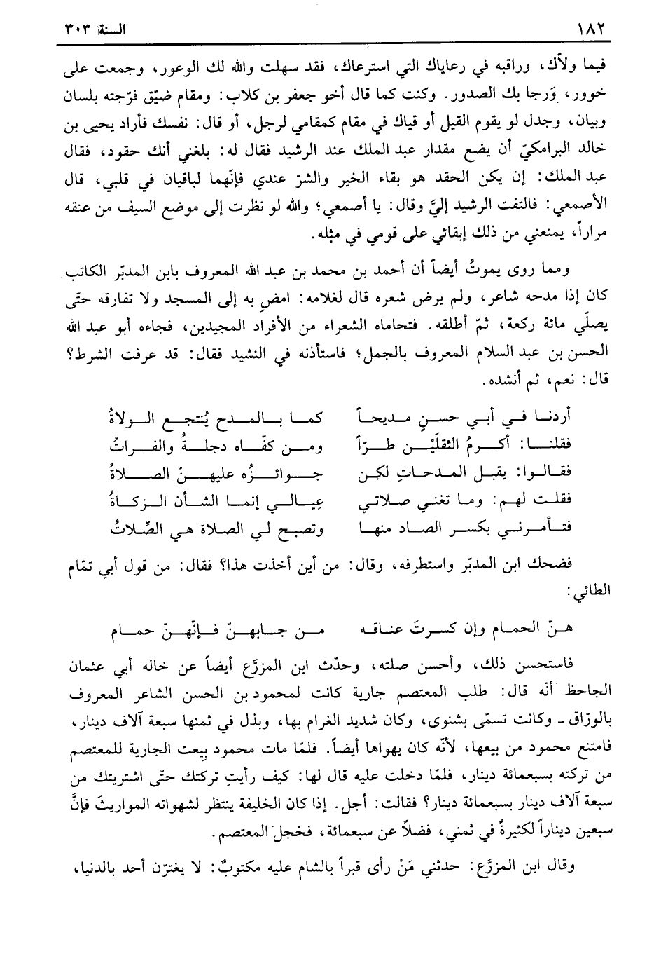ومما روى يموت أيضاً أن أحمد بن محمد بن عبد الله المعروف بابن المدبر الكاتب أن إذا مدحه شاعر، ولم يرض شعره قال لغلامه: امض به إلى المسجد ولا تفارقه حتى يصلي مائة ركعة، ثم أطلقه. فتحاماه الشعراء من الأفراد المجيدين، فجاءه أبو عبد الله الحسن بن عبد السلام المعروف بالجمل، فاستأذنه في النشيد فقال: قد عرفت الشرط؟. قال: نعم، ثم أنشده.