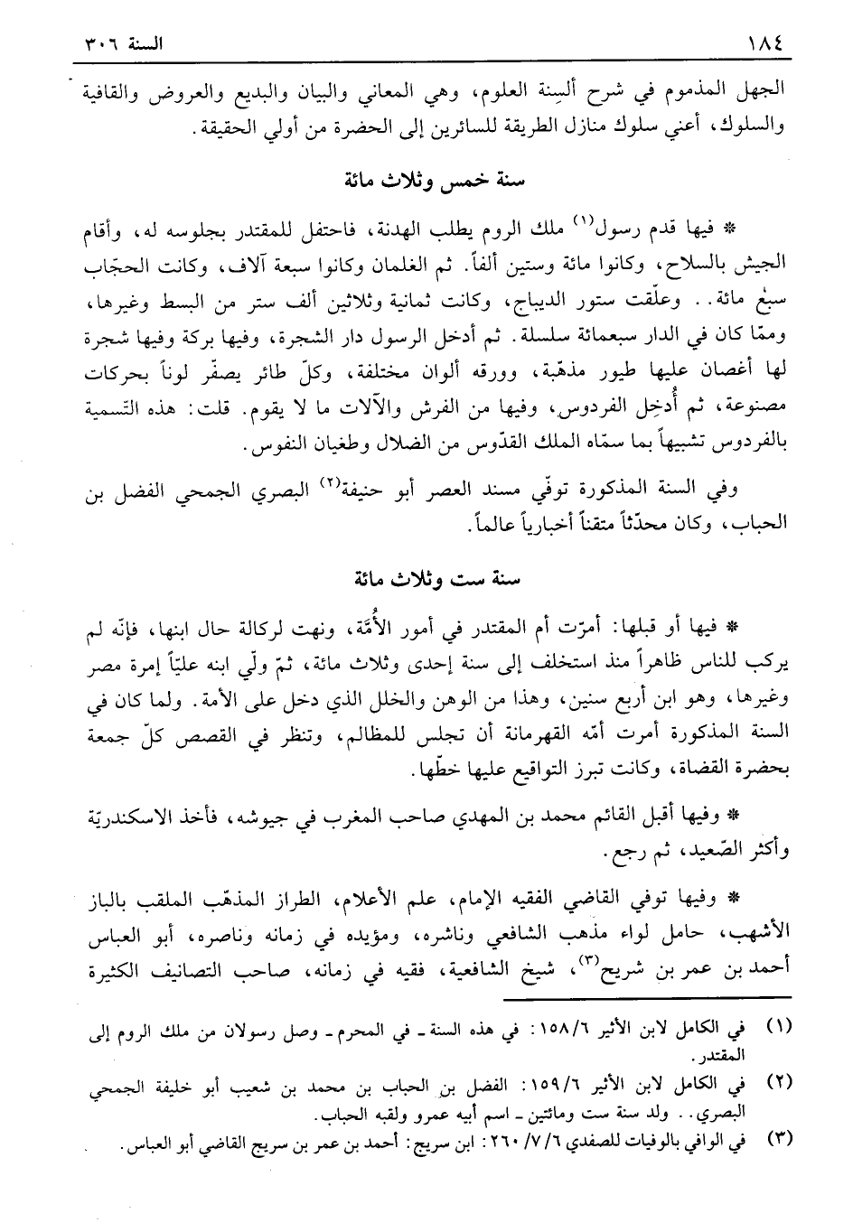 فيها قدم رسول ملك الروم يطلب الهدنة، فاحتفل للمقتدر بجلوسه له، وأقام الجيش بالسلاح، وكانوا عامة وستين ألفاً. ثم الغلمان وكانوا سبعة آلاف، وكانت الحجاب سبع مائة. وعلقت ستور الديباج، وكانت ثمانية وثلاثين ألف ستر من البسط وغيرها، ومما كان في الدار سبعمائة سلسلة. ثم أدخل الرسول دار الشجرة، وفيها بركة وفيها شجرة لها أغصان عليها طيور مذهبة، وورقه ألوان مختلفة، وكل طائر يصفر لوناً بحركات مصنوعة، ثم أدخل الفردوس، وفيها من الفرش والآلات ما لا يقوم. قلت: هذه التسمية بالفردوس تشبيهاً بما سماه الملك القدوس من الضلال وطغيان النفوس.