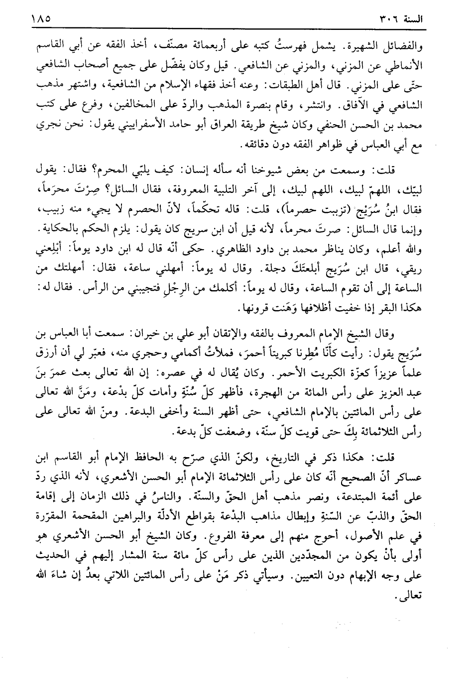 قلت: هكذا ذكر في التاريخ، ولكن الذي صرح به الحافظ الإمام أبو القاسم عساكر أن الصحيح أنه كان على رأس الثلاثمائة الإمام أبو الحسن الأشعري، لأنه الذي على أئمة المبتدعة، ونصر مذهب أهل الحق والسنة. والناس في ذلك الزمان إلى إقامة الحق والذب عن السنة وإبطال مذاهب البدعة بقواطع الأدلة والبراهين المقحمة المقررة في علم الأصول، أحوج منهم إلى معرفة الفروع. وكان الشيخ أبو الحسن الأشعري أولى بأن يكون من المجددين الذين على رأس كل مائة سنة المشار إليهم في الحديث على وجه الإبهام دون التعيين. وسيأتي ذكر من على رأس المائتين اللاتي بعد إن شاء تعالى.