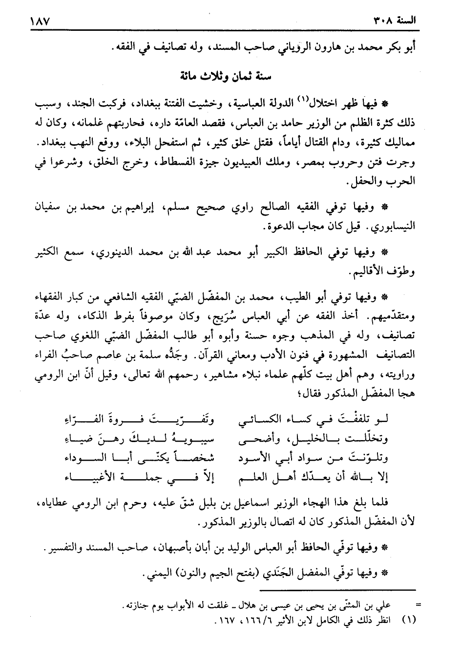 وفيها توفي أبو الطيب، محمد بن المفضل الضبي الفقيه الشافعي من كبار الفقهاء ومتقدميهم. أخذ الفقه عن أبي العباس سريج، وكان موصوفاً بفرط الذكاء، وله تصانيف، وله في المذهب وجوه حسنة وأبوه أبو طالب المفضل الضبي اللغوي صاحب التصانيف المشهورة في فنون الأدب ومعاني القرآن. وجده سلمة بن عاصم صاحب الفراء وراويته، وهم أهل بيت كلهم علماء نبلاء مشاهير، رحمهم الله تعالى، وقيل أن ابن الرومي هجا المفضل المذكور فقال: