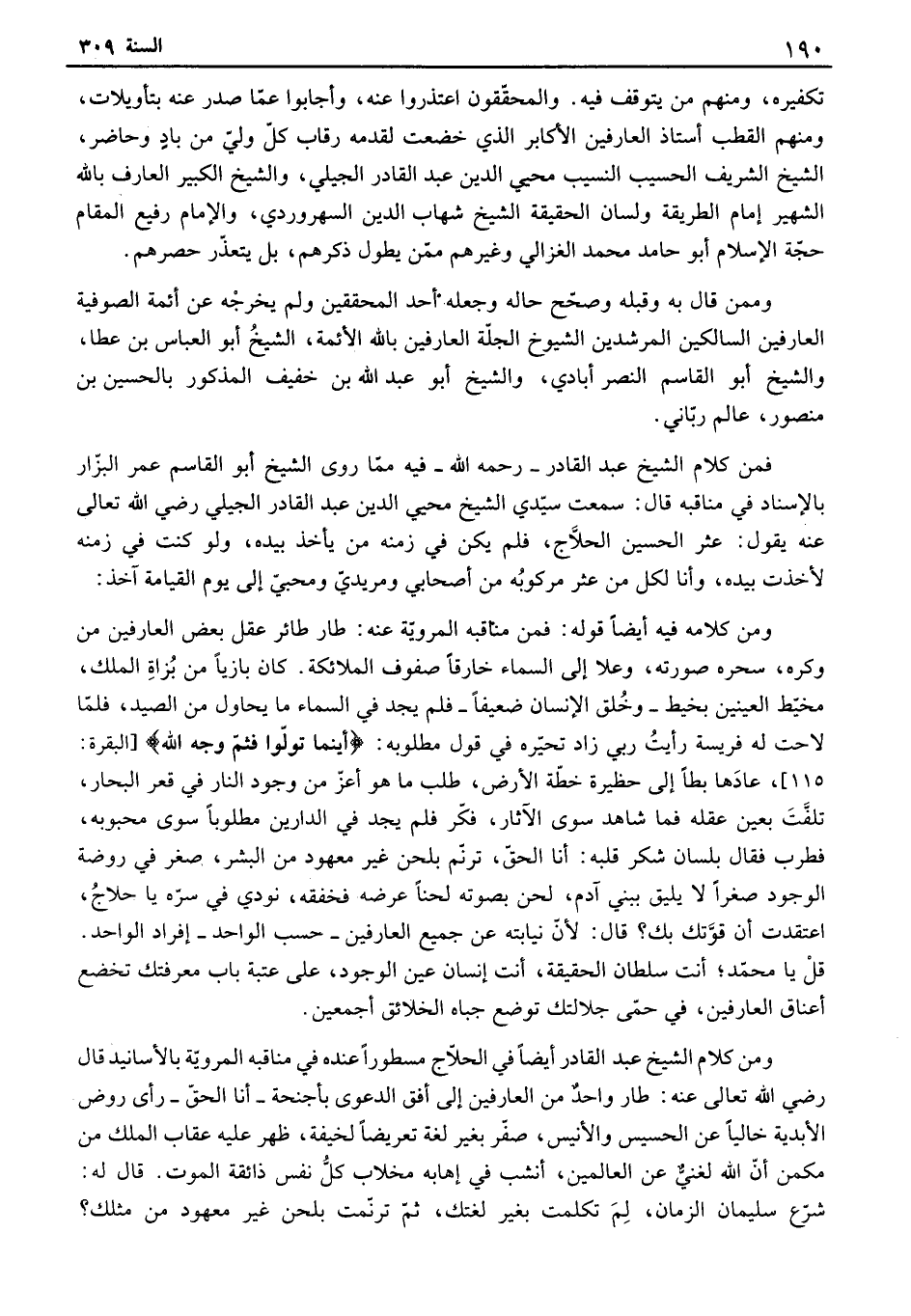 تكفيره، ومنهم من يتوقف فيه. والمحققون اعتذروا عنه، وأجابوا عما صدر عنه بتأويلات، ومنهم القطب أستاذ العارفين الأكابر الذي خضعت لقدمه رقاب كل ولي من باد وحاضر، الشيخ الشريف الحسيب النسيب محي الدين عبد القادر الجيلي، والشيخ الكبير العارف بالله الشهير إمام الطريقة ولسان الحقيقة الشيخ شهاب الدين السهروردي، والإمام رفيع المقام حجة الإسلام أبو حامد محمد الغزالي وغيرهم ممن يطول ذكرهم، بل يتعذر حصرهم.