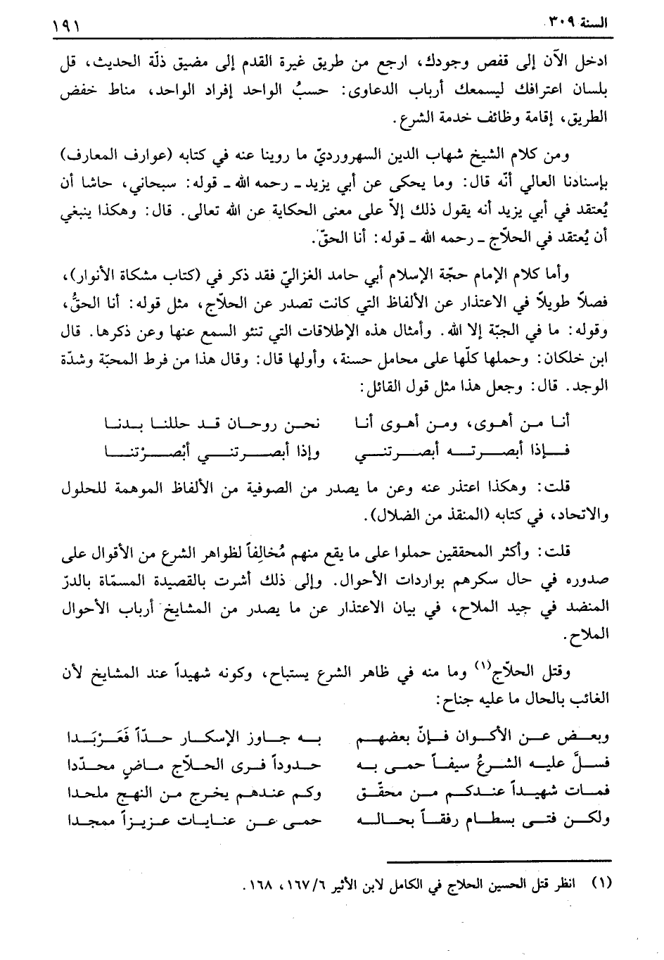 ومن كلام الشيخ شهاب الدين السهروردي ما روينا عنه في كتابه " عوارف المعارف " بإسنادنا العالي أنه قال: وما يحكى عن أبي يزيد رحمه الله قوله: سبحاني، حاشا أن يعتقد في أبي يزيد أنه يقول ذلك إلا على معنى الحكاية عن الله تعالى. قال: وهكذا ينبغي أن يعتقد في الحلآج رحمه الله قوله: أنا الحق.