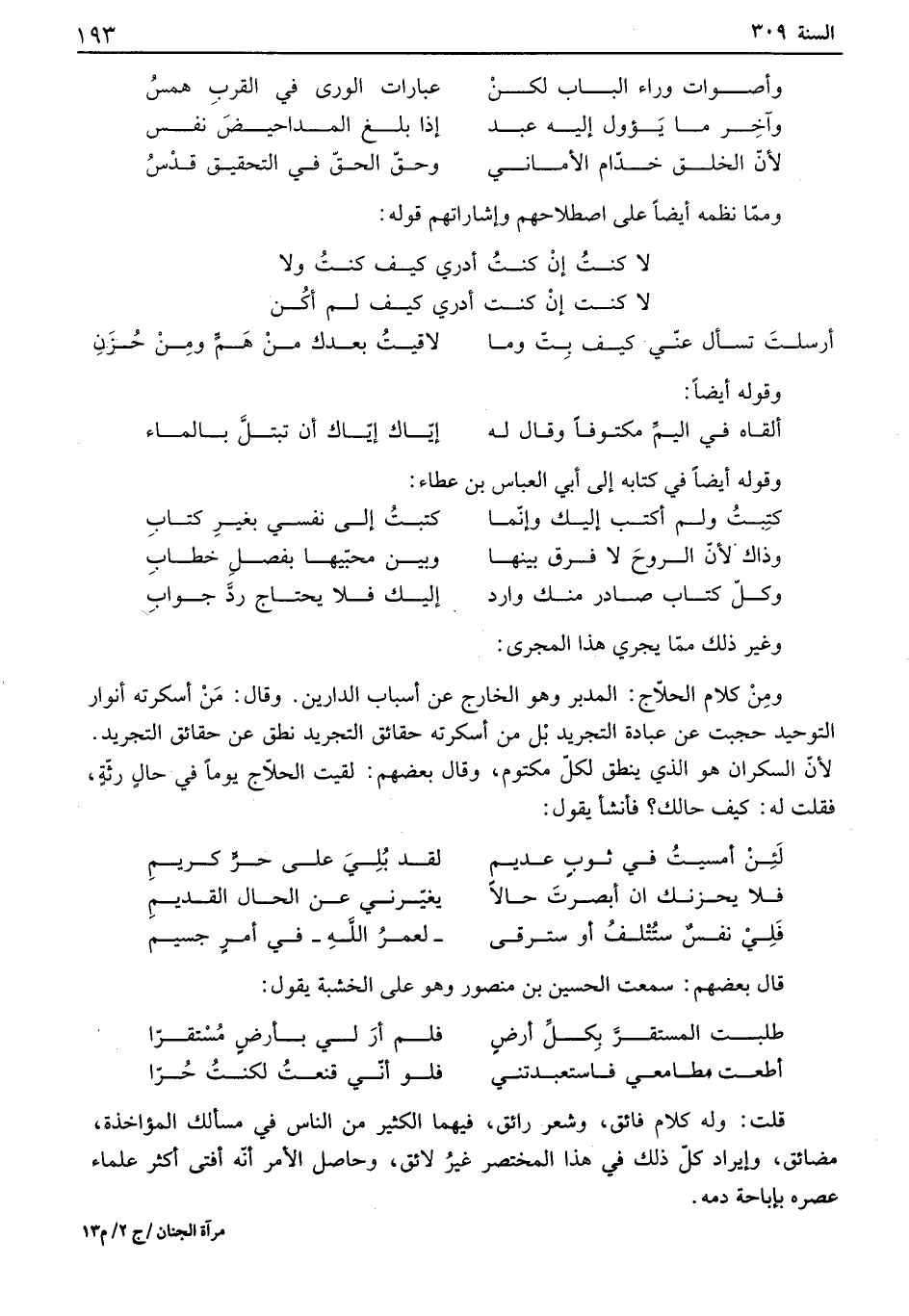 وغير ذلك مما يجري هذا المجرى: ومن كلام الحلاج: المدبر وهو الخارج عن أسباب الدارين. وقال: من أسكرته أنوار التوحيد حجبت عن عبادة التجريد بل من أسكرته حقائق التجريد نطق عن حقائق التجريد. لأن السكران هو الذي ينطق لكل مكتوم، وقال بعضهم: لقيت الحلاج يوماً في حال رثة، فقلت له: كيف حالك؟. فأنشأ يقول: