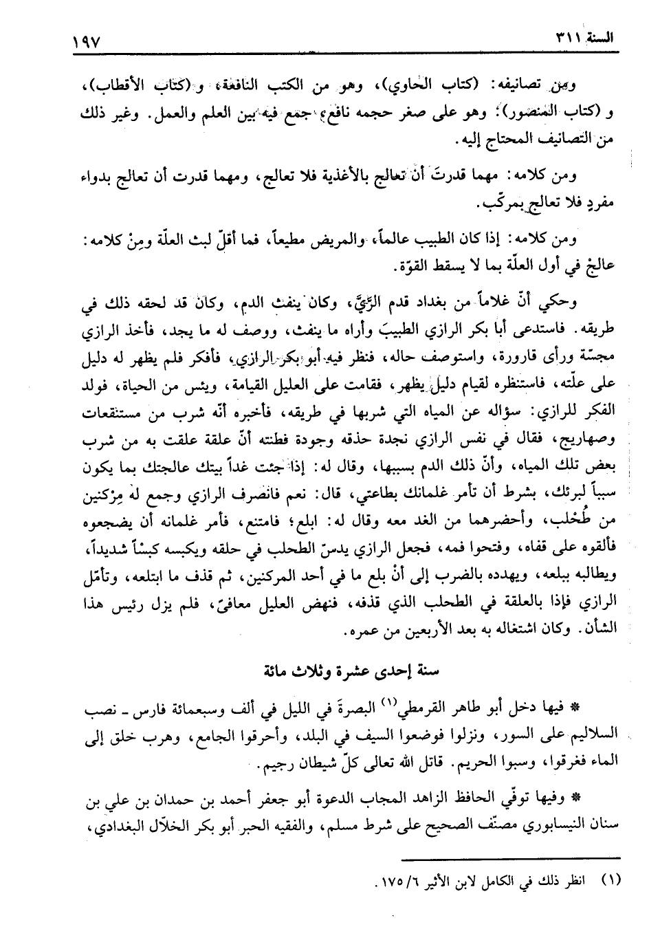 وفيها توفي الحافظ الزاهد المجاب الدعوة أبو جعفر أحمد بن حمدان بن علي بن سنان النيسابوري مصنف الصحيح على شرط مسلم، والفقيه الحبر أبو بكر الخلال البغدادي،