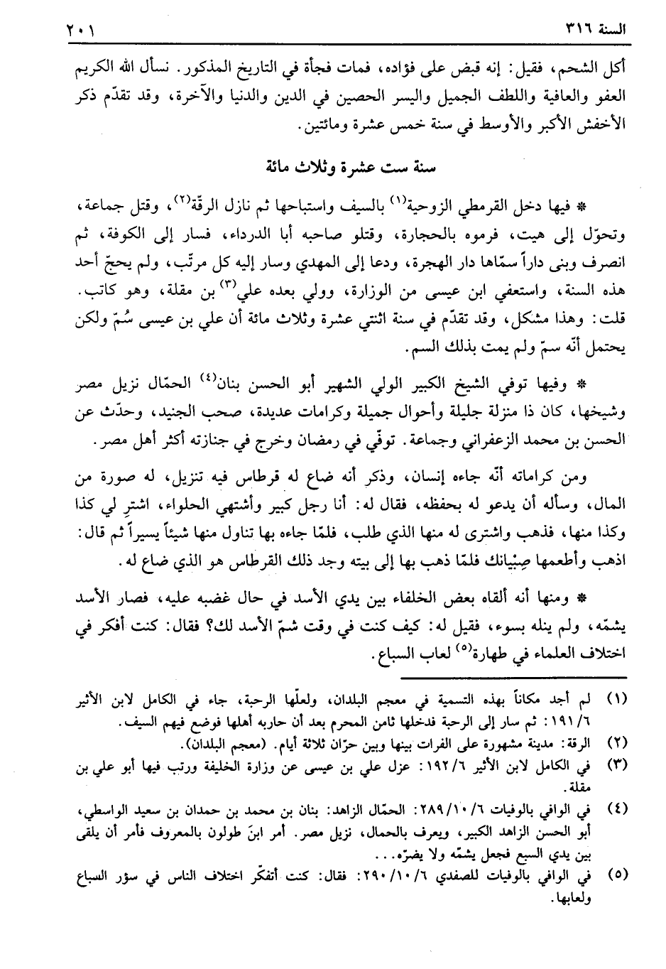 وفيها توفي الشيخ الكبير الولي الشهير أبو الحسن بنان الحمال نزيل مصر وشيخها، كان ذا منزلة جليلة وأحوال جميلة وكرامات عديدة، صحب الجنيد، وحدث عن الحسن بن محمد الزعفراني وجماعة. توفي في رمضان وخرج في جنازته أكثر أهل مصر. ومن كراماته أنه جاءه إنسان، وذكر أنه ضاع له قرطاس فيه تنزيل، له صورة من المال، وسأله أن يدعو له بحفظه، فقال له: أنا رجل كبير وأشتهي الحلواء، اشتر لي كذا وكذا منها، فذهب واشترى له منها الذي طلب، فلما جاءه بها تناول منها شيئاً يسيراً ثم قال: اذهب وأطعمها صبيانك فلما ذهب بها إلى بيته وجد ذلك القرطاس هو الذي ضاع له.