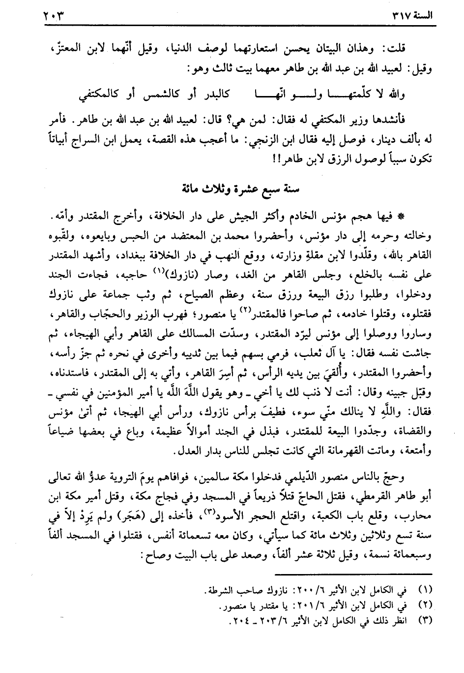 وحج بالناس منصور الديلمي فدخلوا مكة سالمين، فوافاهم يوم التروية عدو الله تعالى أبو طاهر القرمطي، فقتل الحاج قتلاً ذريعاً في المسجد وفي فجاج مكة، وقتل أمير مكة ابن محارب، وقلع باب الكعبة، واقتلع الحجر الأسود، فأخذه إلى " هجر " ولم يرد إلا في سنة تسع وثلاثين وثلاث مائة كما سيأتي، وكان معه تسعمائة أنفس، فقتلوا في المسجد ألفاً وسبعمائة نسمة، وقيل ثلاثة عشر ألفاً، وصعد على باب البيت وصاح:
