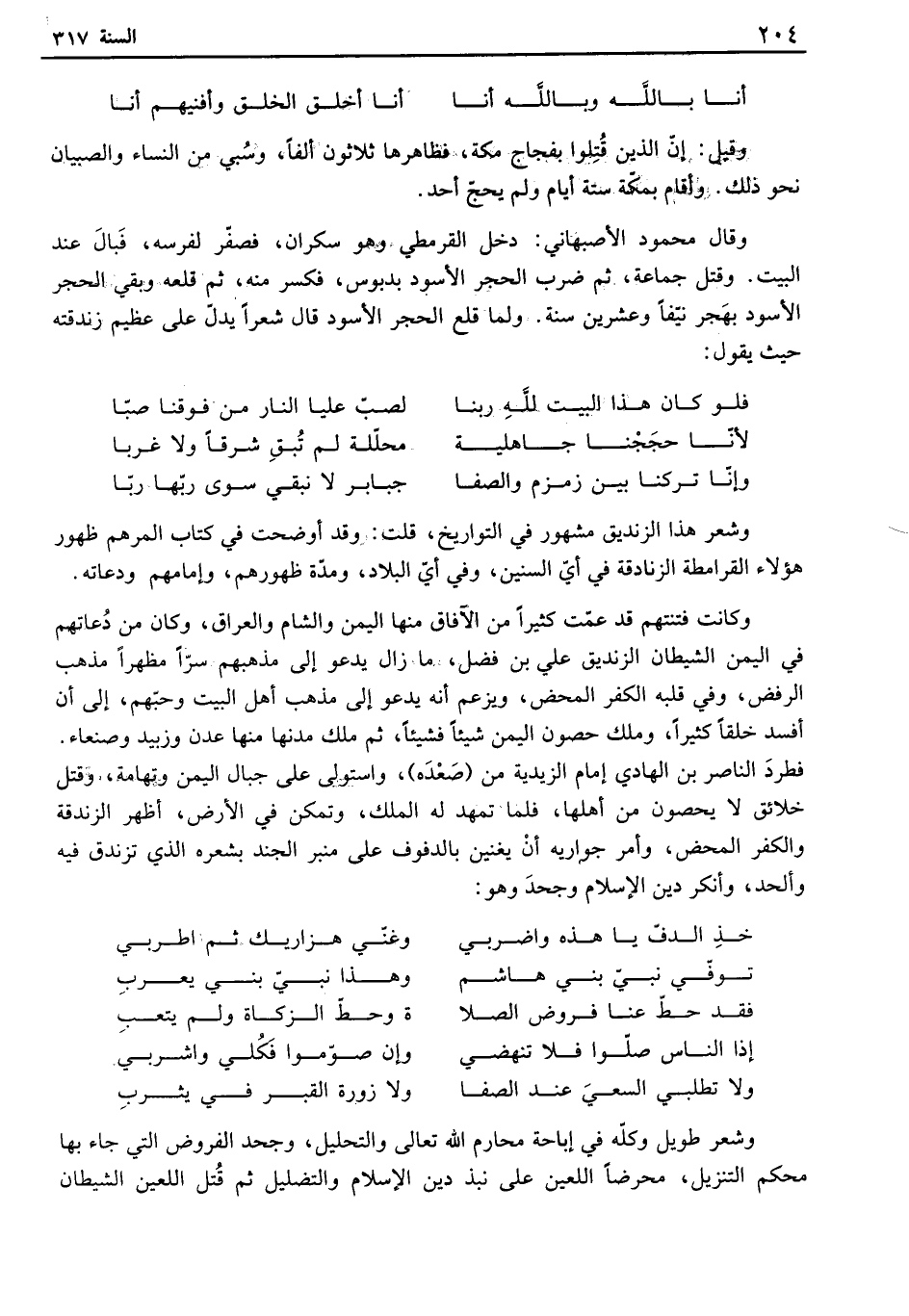وشعر هذا الزنديق مشهور في التواريخ، قلت: وقد أوضحت في كتاب المرهم ظهور هؤلاء القرامطة الزنادقة في أي السنين، وفي أي البلاد، ومدة ظهورهم، وإمامهم ودعاته.