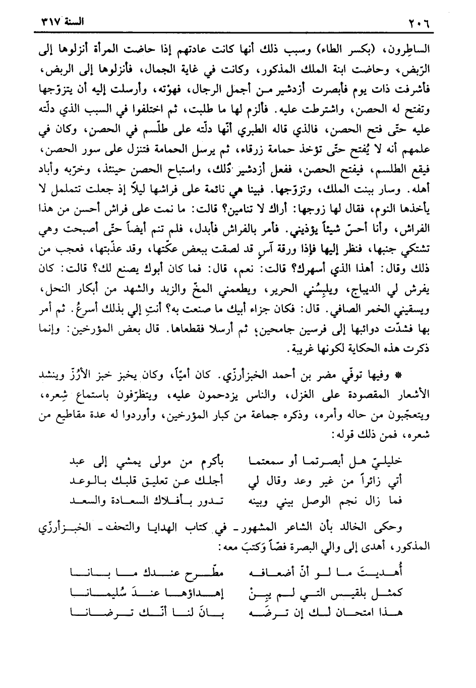 وفيها توفي مضر بن أحمد الخبزارزي. كان أمياً، وكان يخبز خبز الأرز وينشد الأشعار المقصودة على الغزل، والناس يزدحمون عليه، ويتطرفون باستماع شعره، ويتعجبون من حاله وأمره، وذكره جماعة من كبار المؤرخين، وأوردوا له عدة مقاطع من شعره، فمن ذلك قوله: