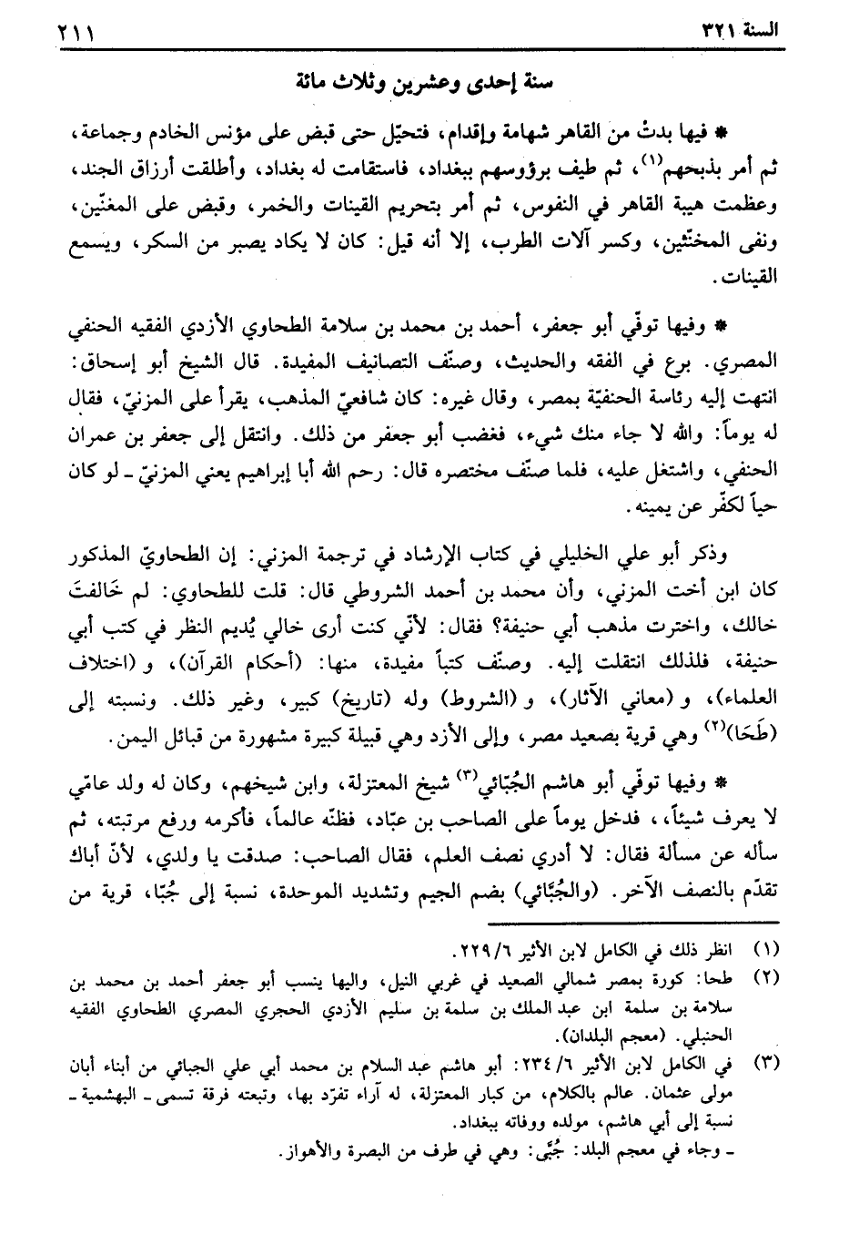 وفيها توفي أبو جعفر، أحمد بن محمد بن سلامة الطحاوي الأزدي الفقيه الحنفي المصري. برع في الفقه والحديث، وصنف التصانيف المفيدة. قال الشيخ أبو إسحاق: انتهت إليه رئاسة الحنفية بمصر، وقال غيره: كان شافعي المذهب، يقرأ على المزني، فقال له يوماً: والله لا جاء منك شيء، فغضب أبو جعفر من ذلك. وانتقل إلى جعفر بن عمران الحنفي، واشتغل عليه، فلما صنف مختصره قال: رحم الله أبا إبراهيم يعني المزني لو كان حياً لكفر عن يمينه.
