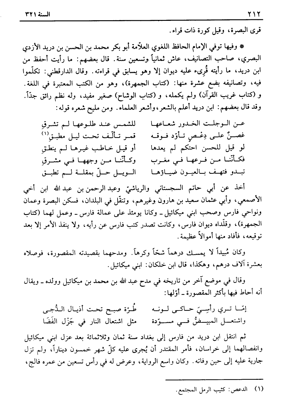 وفيها توفي الإمام الحافظ اللغوي العلامة أبو بكر محمد بن الحسن بن دريد الأزدي البصري، صاحب التصانيف، عاش ثمانياً وتسعين سنة. قال بعضهم: ما رأيت أحفظ من ابن دريد، ما رأيته قرىء عليه ديوان إلا وهو يسابق في قراءته. وقال الدارقطني: تكلموا فيه، وتصانيفه بضع عشرة منها: " كتاب الجمهرة "، وهو من الكتب المعتبرة في اللغة. و " كتاب غريب القرآن " ولم يكمله، و " كتاب الوشاح " صغير مفيد، وله نظم رائق جداً. وقد قال بعضهم: ابن دريد أعلم بالشعر، وأشعر العلماء. ومن مليح شعره قوله: