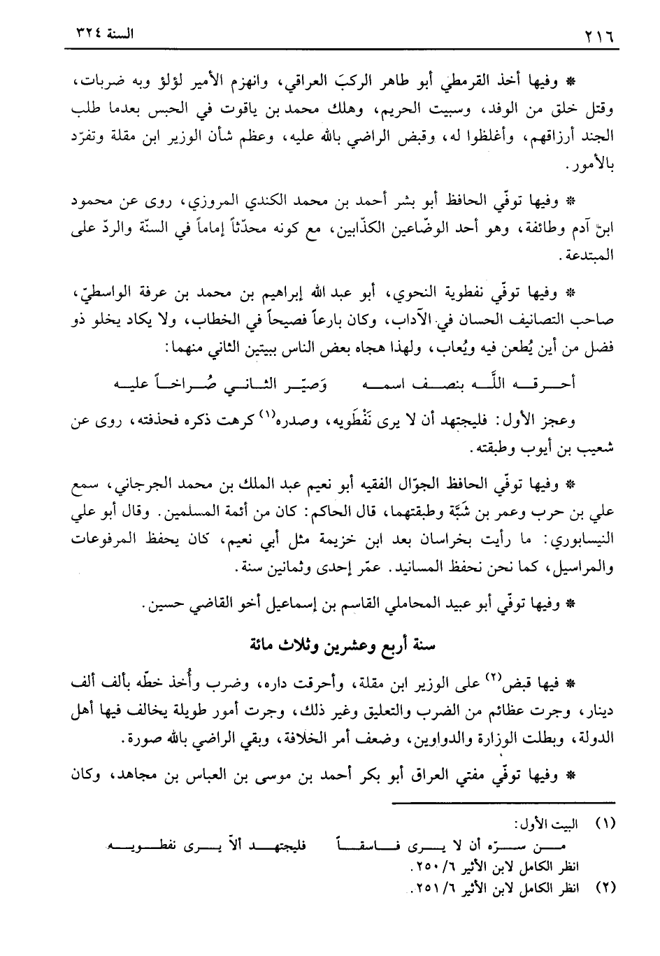 وفيها توفي نفطوية النحوي، أبو عبد الله إبراهيم بن محمد بن عرفة الواسطي، صاحب التصانيف الحسان في الآداب، وكان بارعاً فصيحاً في الخطاب، ولا يكاد يخلو ذو فضل من أين يطعن فيه ويعاب، ولهذا هجاه بعض الناس ببيتين الثاني منهما: