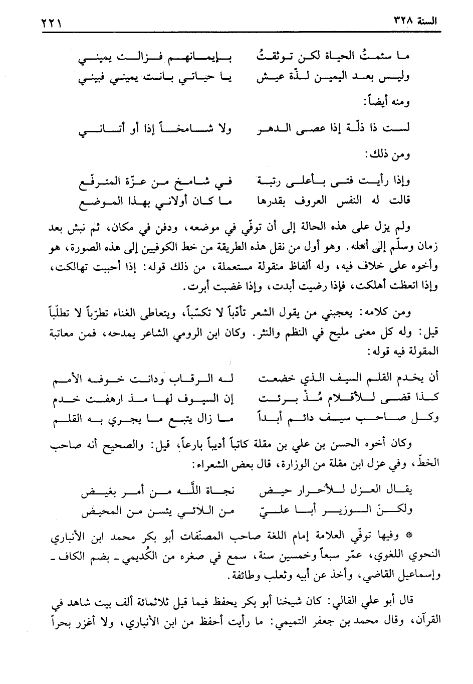 وفيها توفي العلامة إمام اللغة صاحب المصنفات أبو بكر محمد ابن الأنباري النحوي اللغوي، عمر سبعاً وخمسين سنة، سمع في صغره من الكديمي بضم الكاف وإسماعيل القاضي، وأخذ عن أبيه وثعلب وطائفة.