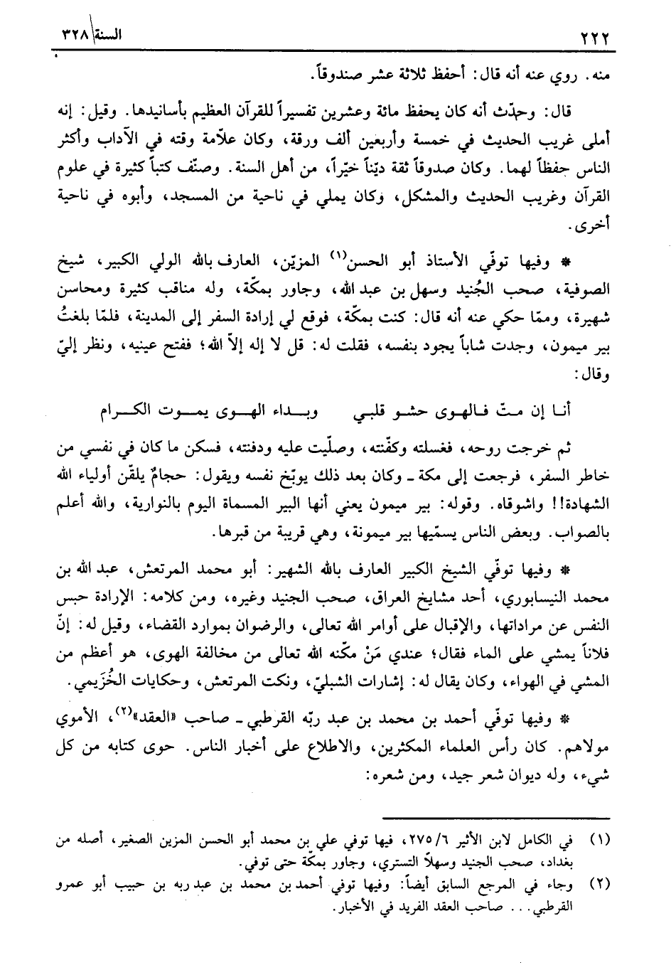 وفيها توفي الأستاذ أبو الحسن المزين، العارف بالله الولي الكبير، شيخ الصوفية، صحب الجنيد وسهل بن عبد الله، وجاور بمكة، وله مناقب كثيرة ومحاسن شهيرة، ومما حكي عنه أنه قال: كنت بمكة، فوقع لي إرادة السفر إلى المدينة، فلما بلغت بير ميمون، وجدت شاباً يجود بنفسه، فقلت له: قل لا إله إلا الله، ففتح عينيه، ونظر إلي وقال: