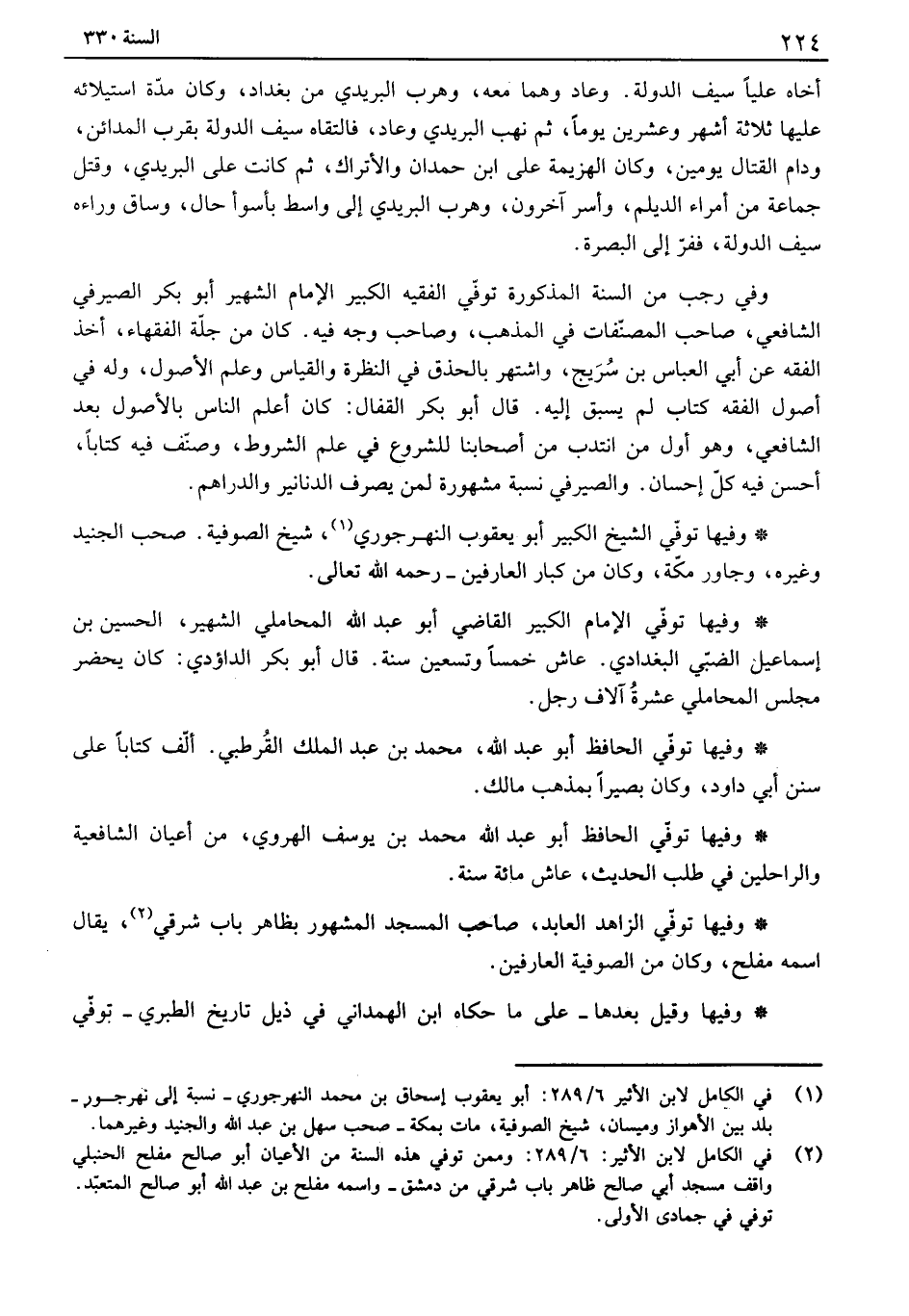 وفي رجب من السنة المذكورة توفي الفقيه الكبير الإمام الشهير أبو بكر الصيرفي الشافعي، صاحب المصنفات في المذهب، وصاحب وجه فيه. كان من جلة الفقهاء، أخذ الفقه عن أبي العباس بن سريج، واشتهر بالحذق في النظرة والقياس وعلم الأصول، وله في أصول الفقه كتاب لم يسبق إليه. قال أبو بكر القفال: كان أعلم الناس بالأصول بعد الشافعي، وهو أول من انتدب من أصحابنا للشروع في علم الشروط، وصنف فيه كتاباً، أحسن فيه كل إحسان. والصيرفي نسبة مشهورة لمن يصرف الدنانير والدراهم.