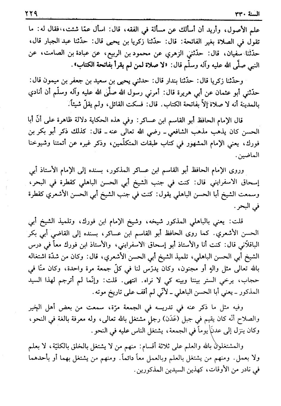 قلت: يعني بالباهلي المذكور شيخه، وشيخ الإمام ابن فورك، وتلميذ الشيخ أبي الحسن الأشعري. كما روى الحافظ أبو القاسم ابن عساكر، بسنده إلى القاضي أبي بكر الباقلاني قال: كنت أنا والأستاذ أبو إسحاق الاسفرايني، والأستاذ ابن فورك معاً في درس الشيخ أبي الحسن الباهلي، تلميذ الشيخ أبي الحسن الأشعري، قال: وكان من شدة اشتغاله بالله تعالى مثل واله أو مجنون، وكان يدرس لنا في كل جمعة مرة واحده، وكان منا في حجاب، يرخي الستر بيننا وبينه كي لا نراه. انتهى. قلت: وإنما لم أترجم لهذا السب المذكور يعني أبا الحسن الباهلي لأني لم أقف على تاريخ موته.