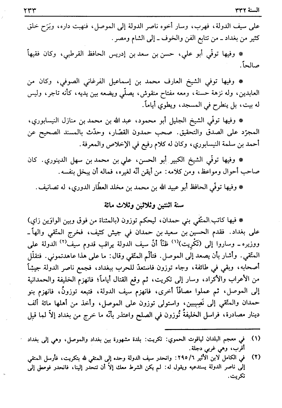 " على سيف الدولة، فهرب، وسار آخوه ناصر الدولة إلى الموصل، فنهبت داره، وبرح خلق كثير من بغداد من تتابع الفن والخوف إلى الشام ومصر.
