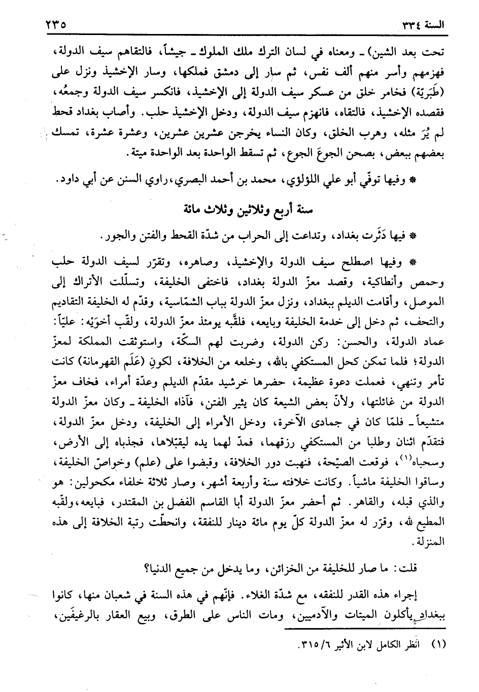 تحت بعد الشين " ومعناه في لسان الترك ملك الملوك جيشاً، فالتقاهم سيف الدولة فهزمهم وأسر منهم ألف نفس، ثم سار إلى دمشق فملكها، وسار الإخشيذ ونزل على " طبرية " فخامر خلق من عسكر سيف الدولة إلى الإخشيذ، فانكسر سيف الدولة وجمعه فقصده الإخشيذ، فالتقاه، فانهزم سيف الدولة، ودخل الاخشيذ حلب. وأصاب بغداد قحط لم ير مثله، وهرب الخلق، وكان النساء يخرجن عشرين عشرين، وعشرة عشرة، تمسك بعضهم ببعض، بصحن الجوع الجوع، ثم تسقط الواحدة بعد الواحدة ميته.