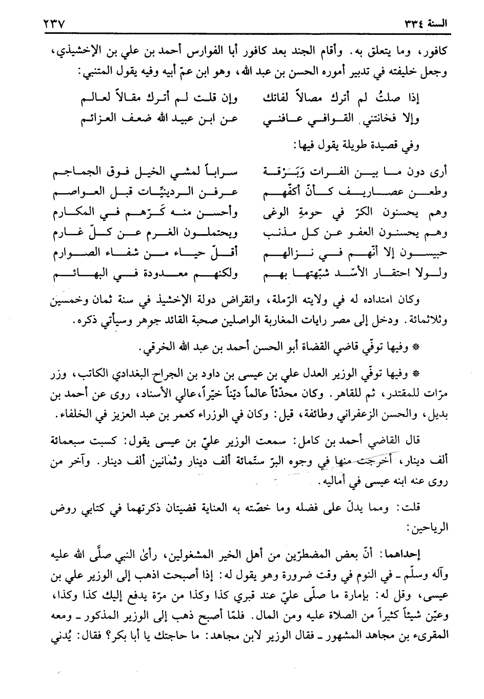 وفيها توفي الوزير العدل علي بن عيسى بن داود بن الجراح البغدادي الكاتب، وزر مرات للمقتدر، ثم للقاهر. وكان محدثاً عالماً ديناً خيراً، عالي الأسناد، روى عن أحمد بن بديل، والحسن الزعفراني وطائفة، قيل: وكان في الوزراء كعمر بن عبد العزيز في الخلفاء.