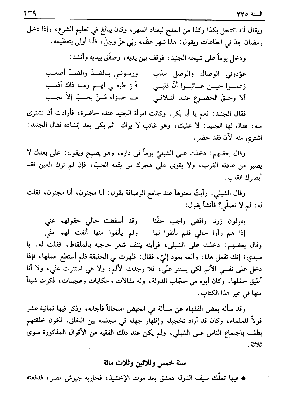 وقال بعضهم: دخلت على الشبلي، فرأيته ينتف شعر حاجبه بالملقاط، فقلت له: سيدي، إنك تفعل هذا، وألمه يعود إلي، فقال: ظهرت لي الحقيقة فلم أستطع حملها، فإذا دخل على نفسي الألم لكي يستتر عني، فلا وجدت الألم، ولا هي استترت عني، ولا أنا أطيق حملها. وكان أبوه من حجاب الدولة، وله مقالات وحكايات وعجيبات، ذكرت شيئاً منها في غير هذا الكتاب.
