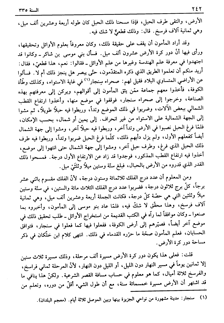 ورأى فيها أن دور كرة الأرض عشرون ألف ميل. فسأل بني موسى بن شاكر - وكانوا قد اجتهدوا في معرفة علم الهندسة وغيرها من علم الأوائل - فقالوا: نعم، هذا قطعي، فقال: أريد منكم أن تعلموا الطريق الذي ذكره المتقدمون، حتى يبصر هل ينجز ذلك أم لا. فسألوا عن الأراضي المتساوي البلاد فقيل لهم: صحراء سنجار في غاية الاستواء، وكذلك وطأة الكوفة، فأخذوا معهم جماعة ممن يثق المأمون إلى أقوالهم، ويركن إلى معرفتهم بهذه الصناعة، وخرجوا إلى صحراء سنجار، فوقفوا في موضع منها، وأخذوا ارتفاع القطب الشمالي ببعض الآلات، وضربوا في ذلك الموضع وتداً، وربطوا فيه حبلاً طويلاً، ثم مشوا إلى الجهة الشمالية على الاستواء من غير انحراف. إلى يمين أو شمال، بحسب الإمكان، فلما فرغ الحبل نصبوا في الأرض وتداً آخر، وربطوا فيه حبلاً آخر، ومشوا إلى جهة الشمال أيضاً كفعلهم الأول، ولم يزل دأبهم ذلك، كلما فرغ الحبل ضربوا وتداً، وربطوا فيه طرف ذلك الحبل الذي فرغ، وطرف حبل آخر، ومشوا إلى جهة الشمال حتى انتهوا إلى موضع، أخذوا فيه ارتفاع القطب المذكور، فوجدوا قد زاد عن الارتفاع الأول درجة. فمسحوا ذلك القدر الذي قدروه من الأرض بالحبال، فبلغ ستة وستين ميلاً وثلثي ميل.