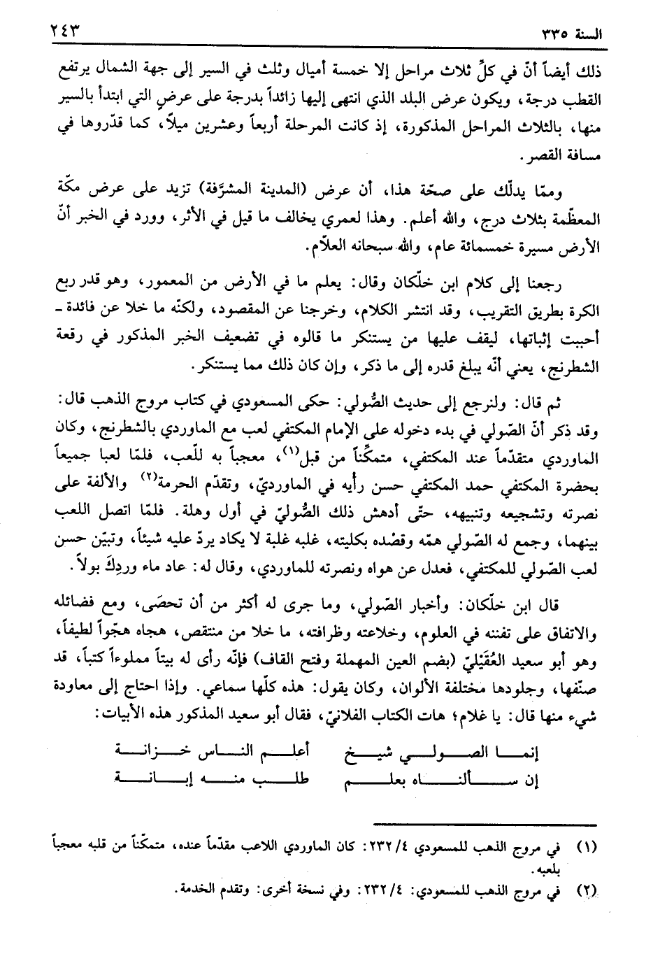 ثم قال: ولنرجع إلى حديث الصولي: حكى المسعودي في كتاب مروج الذهب قال: وقد ذكر أن الصولي في بدء دخوله على الإمام المكتفي لعب مع الماوردي بالشطرنج، وكان الماوردي متقدماً عند المكتفي، متمكناً من قبل، معجباً به للعب، فلما لعبا جميعاً بحضرة المكتفي حمد المكتفي حسن رأيه في الماوردي، وتقدم الحرمة والألفة على نصرته وتشجيعه وتنبيهه، حتى أدهش ذلك الصولي في أول وهلة، فلما اتصل اللعب بينهما، وجمع له الصولي هذه وقصده بكليته، غلبه غلبة لا يكاد يرد عليه شيئاً، وتبين حسن لعب الصولي للمكتفي، فعدل عن هواه ونصرته للماوردي، وقال له عاد ماء وردك بولاً.