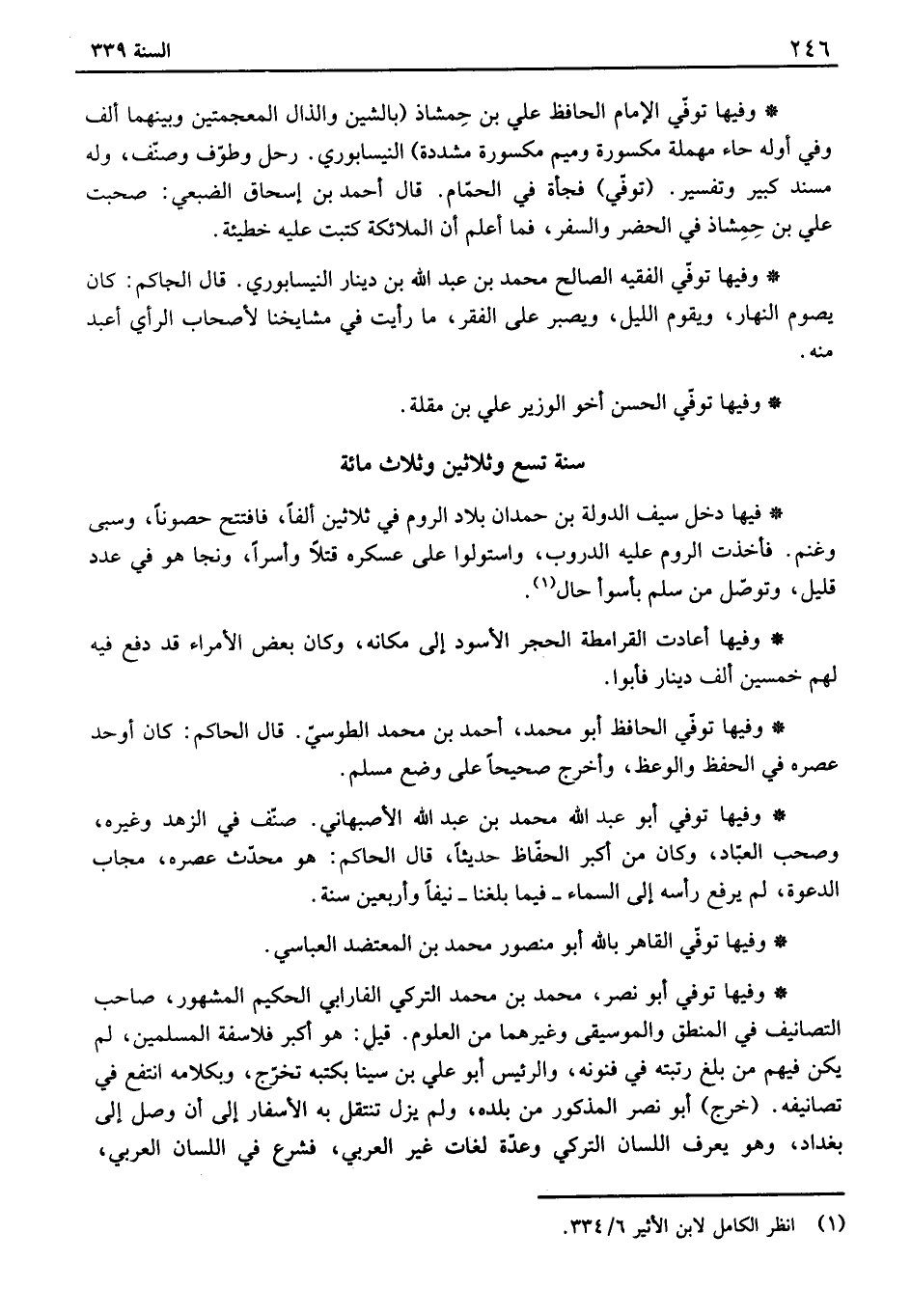 وفيها توفي أبو نصر، محمد بن محمد التركي الفارابي الحكيم المشهور، صاحب التصانيف في المنطق والموسيقى وغيرهما من العلوم. قيل: هو أكبر فلاسفة المسلمين، لم يكن فيهم من بلغ رتبته في فنونه، والرئيس أبو علي بن سينا بكتبه تخرج، وبكلامه انتفع في تصانيفه. خرج أبو نصر المذكور من بلده، ولم يزل تنتقل به الأسفار إلى أن وصل إلى بغداد وهو يعرف اللسان التركي وعدة لغات غير العربي، فشرع في اللسان العربي،