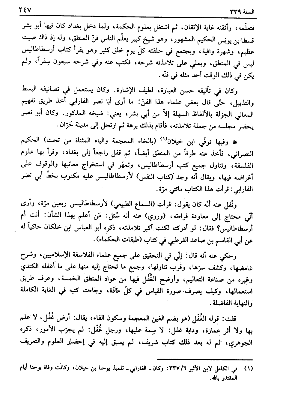 وفيها توفي ابن خيلان بالخاء المعجمة والياء المثناة من تحت الحكيم النصراني، فأخذ عنه طرفاً من المنطق أيضاً، ثم قفل راجعاً إلى بغداد، وقرأ بها علوم الفلسفة، وتناول جميع كتب أرسطاطاليس، وتمهر في استخراج معانيها والوقوف على أغراضه فيها، ويقال أنه وجد. كتاب النفس لأرسطاطاليس عليه مكتوب بخط أبي نصر الفارابي: قرأت هذا الكتاب مائتي مرة.