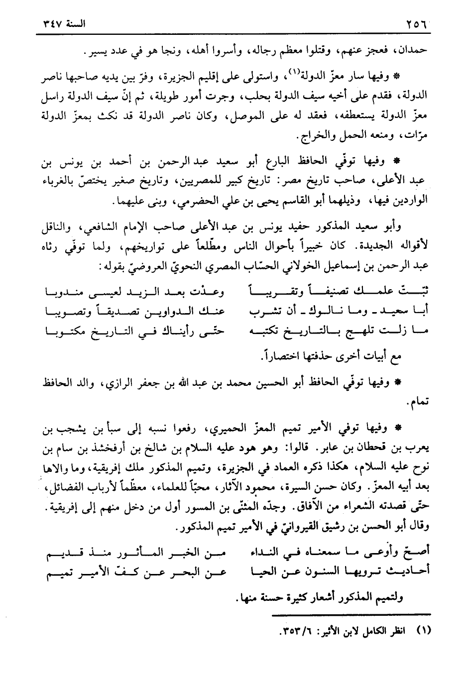 وفيها توفي الحافظ البارع أبو سعيد عبد الرحمن بن أحمد بن يونس بن عبد الأعلى، صاحب تاريخ مصر: تاريخ كبير للمصريين، وتاريخ صغير يختص بالغرباء الواردين فيها، وذيلهما أبو القاسم يحيى بن علي الحضرمي، وبنى عليهما.