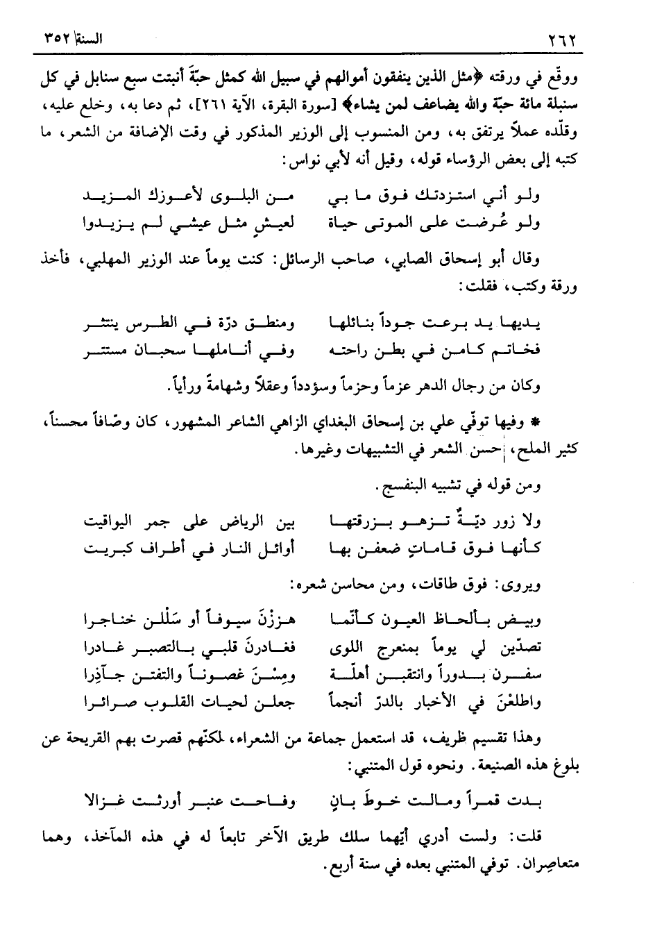 ووقع في ورقته " مثل الذين ينفقون أموالهم في سبيل الله كمثل حبة أنبتت سبع سنابل في كل سنبلة مائة حبة والله يضاعف لمن يشاء " سورة البقرة، الآية 261، ثم دعا به، وخلع عليه، وقلده عملاً يرتفق به، ومن المنسوب إلى الوزير المذكور في وقت الإضافة من الشعر، ما كتبه إلى بعض الرؤساء قوله، وقيل أنه لأبي نواس: