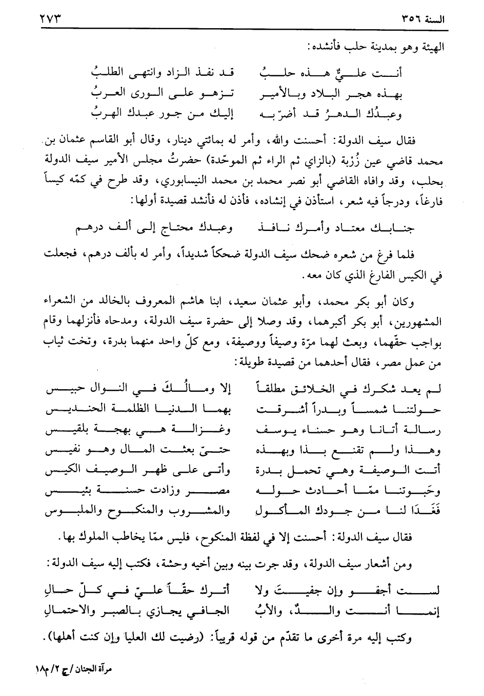 وكان أبو بكر محمد، وأبو عثمان سعيد، ابنا هاشم المعروف بالخالد من الشعراء المشهورين، أبو بكر أكبرهما، وقد وصلا إلى حضرة سيف الدولة، ومدحاه فأنزلهما وقام بواجب حقهما، وبعث لهما مرة وصيفاً ووصيفة، ومع كل واحد منهما بدرة، وتخت ثياب من عمل مصر، فقال أحدهما من قصيدة طويلة: