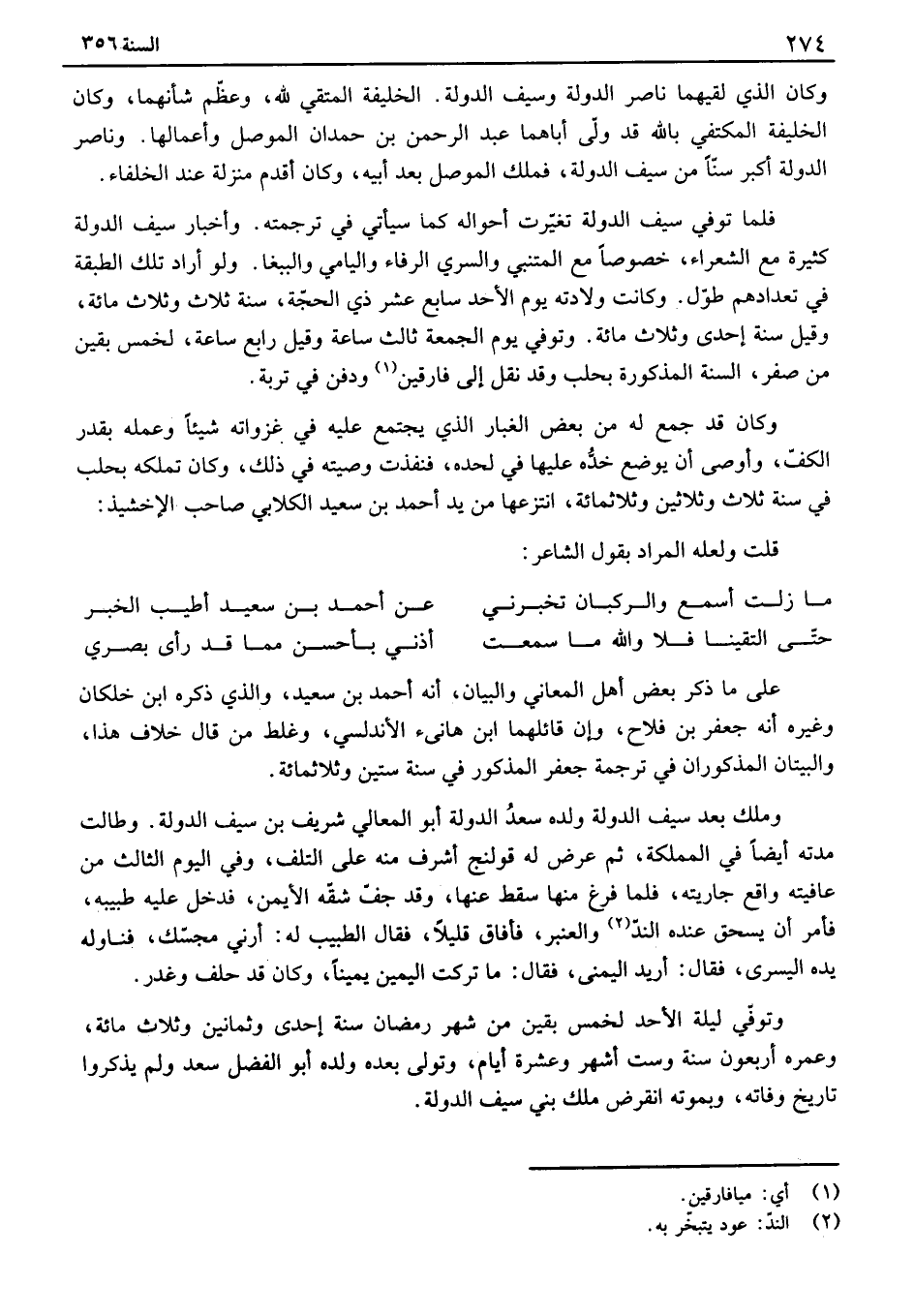 فلما توفي سيف الدولة تغيرت أحواله كما سيأتي في ترجمته. وأخبار سيف الدولة كثيرة مع الشعراء، خصوصاً مع المتنبي والسري الرفاء واليامي والببغا. ولو أراد تلك الطبقة في تعدادهم طول. وكانت ولادته يوم الأحد سابع عشر ذي الحجة، سنة ثلاث وثلاث مائة، وقيل سنة إحدى وثلاث مائة. وتوفي يوم الجمعة ثالث ساعة وقيل رابع ساعة، لخمس بقين من صفر، السنة المذكورة بحلب وقد نقل إلى فارقين ودفن في تربة.