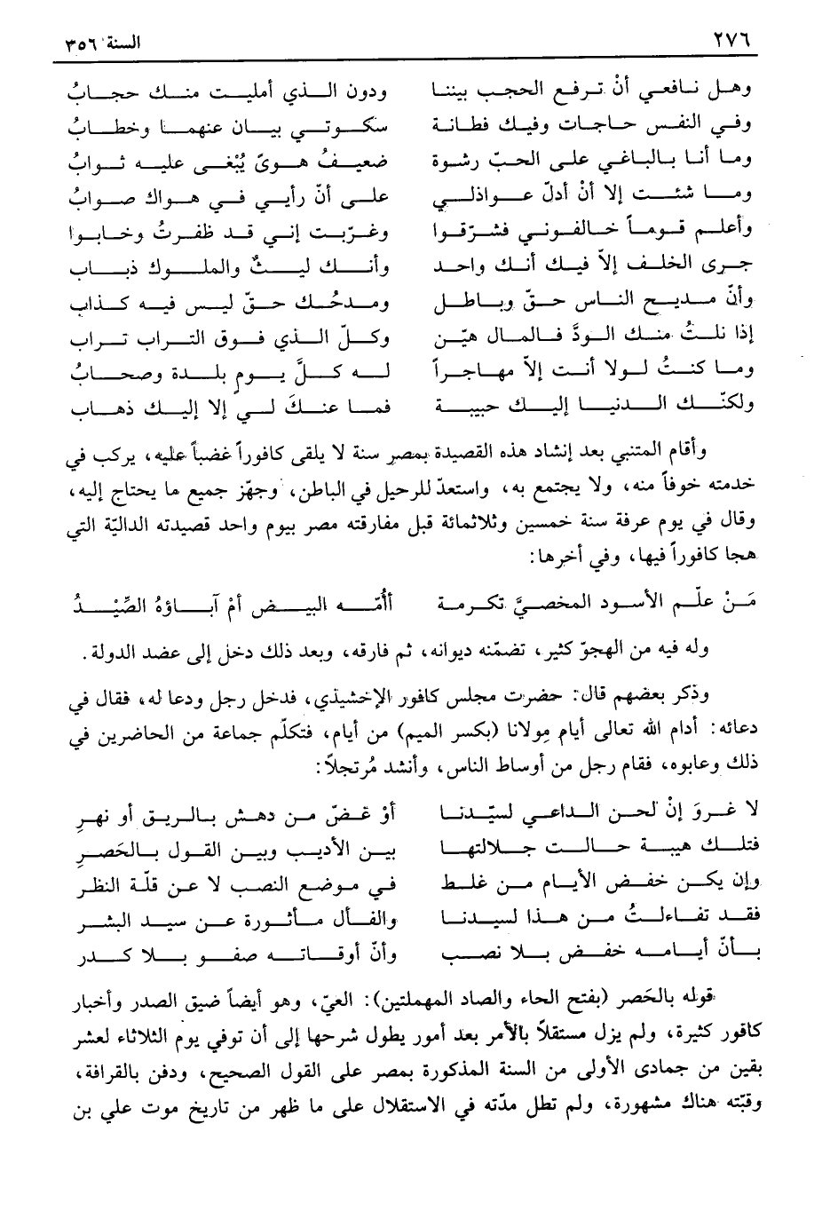 قوله بالحصر " بفتح الحاء والصاد المهملتين ": العي، وهو أيضاً ضيق الصدر وأخبار كافور كثيرة، ولم يزل مستقلاً بالأمر بعد أمور يطول شرحها إلى أن توفي يوم الثلاثاء لعشر بقين من جمادى الأولى من السنة المذكورة بمصر على القول الصحيح، ودفن بالقرافة، وقبته هناك مشهورة، ولم تطل مدته في الاستقلال على ما ظهر من تاريخ موت علي بن