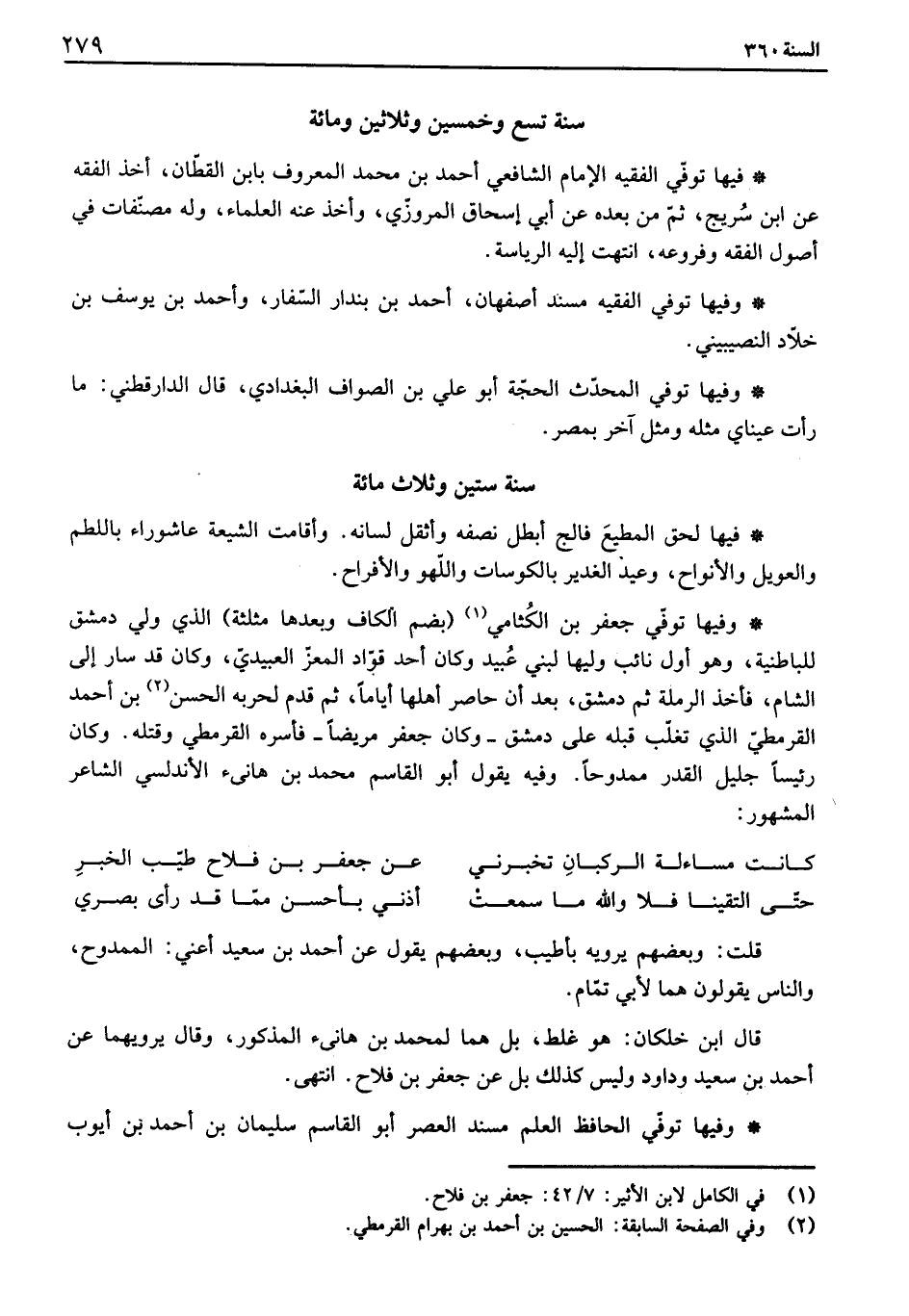 فيها توفي الفقيه الإمام الشافعي أحمد بن محمد المعروف بابن القطان، أخذ الفقه عن ابن سريج، ثم من بعده عن أبي إسحاق المرزوي، وأخذ عنه العلماء، وله مصنفات في أصول الفقه وفروعه، انتهت إليه الرياسة.