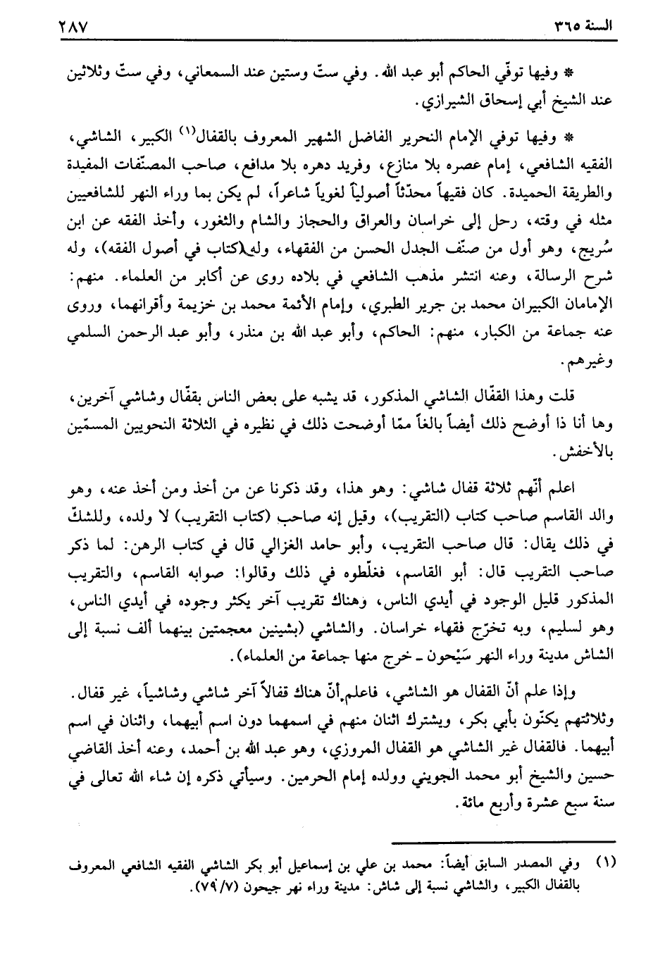 وفيها توفي الإمام النحرير الفاضل الشهير المعروف بالقفال الكبير، الشاشي، الفقيه الشافعي، إمام عصره بلا منازع، وفريد دهره بلا مدافع، صاحب المصنفات المفيدة والطريقة الحميدة. كان فقيهاً محدثاً أصولياً لغوياً شاعراً، لم يكن بما وراء النهر للشافعيين مثله في وقته، رحل إلى خراسان والعراق والحجاز والشام والثغور، وأخذ الفقه عن ابن سريج، وهو أول من صنف الجدل الحسن من الفقهاء، وله كتاب في أصول الفقه، وله شرح الرسالة، وعنه انتشر مذهب الشافعي في بلاده روى عن أكابر من العلماء. منهم: الإمامان الكبيران محمد بن جرير الطبري، وإمام الأئمة محمد بن خزيمة وأقرانهما، وروى عنه جماعة من الكبار، منهم: الحاكم، وأبو عبد الله بن منذر، وأبو عبد الرحمن السلمي وغيرهم.
