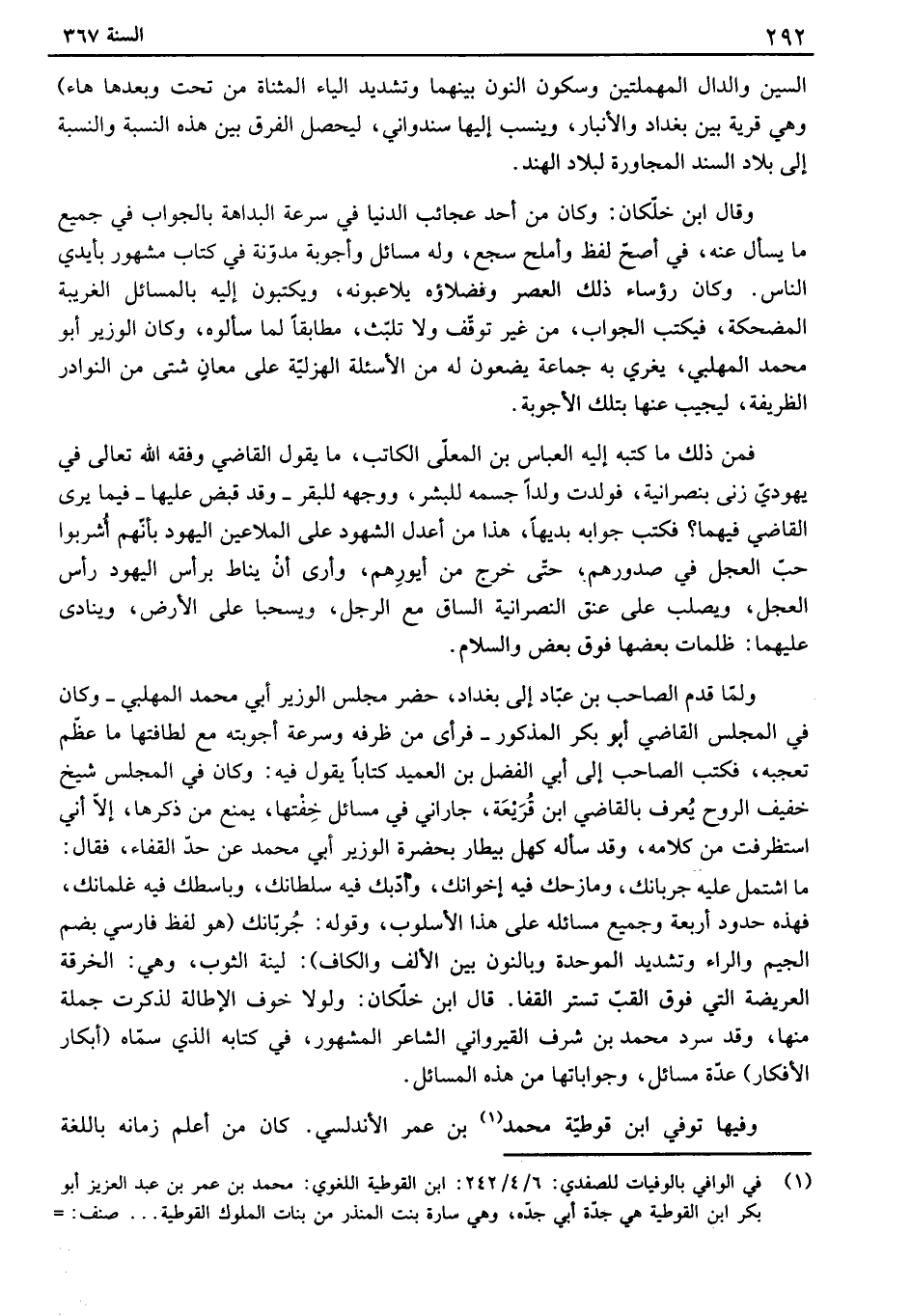وفيها توفى ابن قوطية محمد بن عمر الأندلسي. كان منا أعلم زمانه باللغة